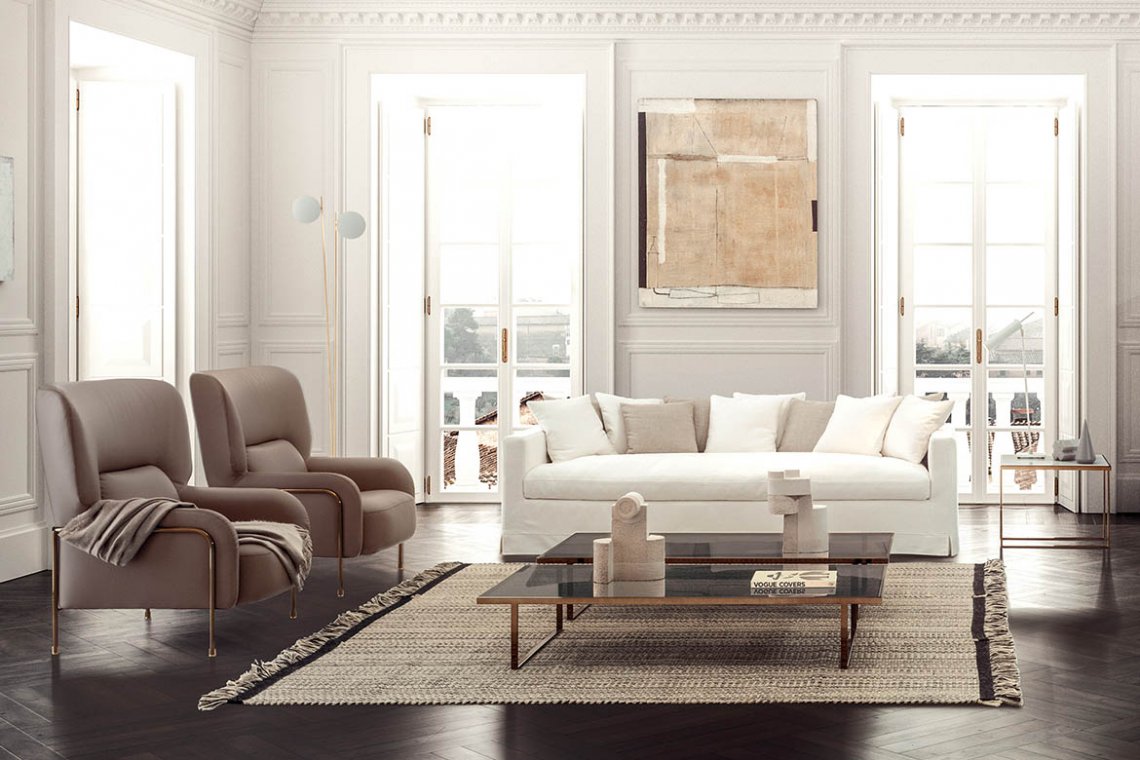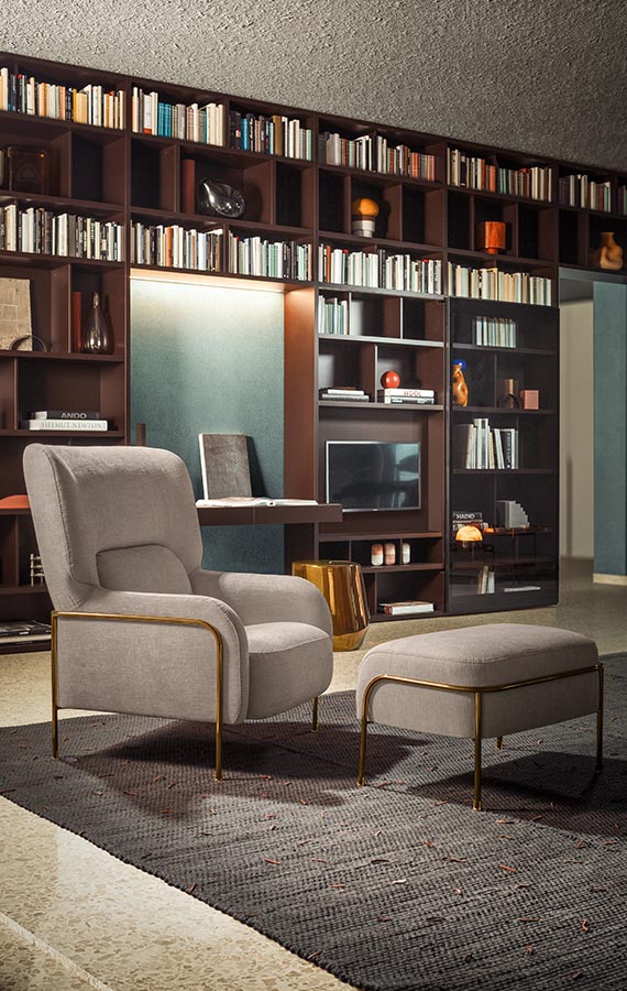 leathers and fabrics of the Pianca collection, including manmade leathers. The base is made up of a tubular structure that follows the contours of the armchair and finishes up on eclectic brass shoes. It is definitely a distinguishing element and is available in all the metal finishes and matt lacquers of the range. Thee perfect bedroom or living room armchair, Platea is also available with an optional pouf. connotative seams around the outer edges.