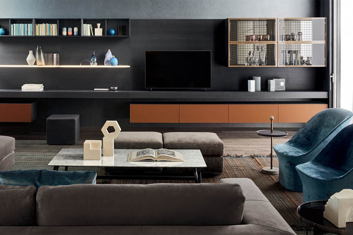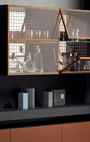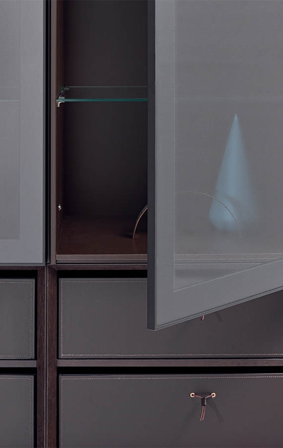 Geometric design meets sophisticated detail. Elegance is the key to rediscovering the beauty of everyday living. The modular People system is the perfect solution for those who love to see their ideas take shape, customising their home interiors with freedom and refined beauty. The mitre-folding carcass and absence of handles create a flowing, subtle design, with contrasting luxurious accent details, like the spacer elements, backlit glass shelves, new hard leather fronts and back panels in materico marble.