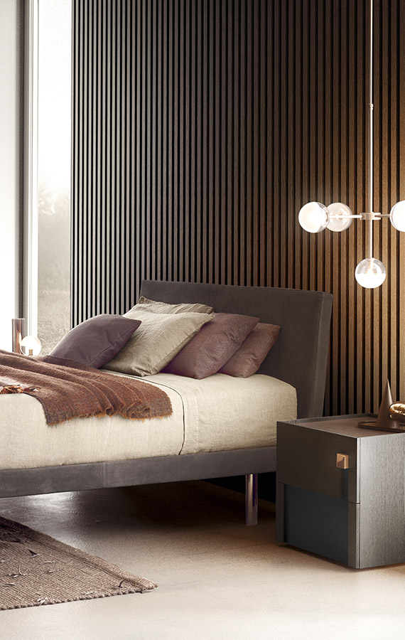 Delicate shades reveal the strength of those who know how to play the co-star. An interplay of elements complementary to the other furniture in the room creates a perfect chorus of harmonious voices. A simple, elegant design offers a multitude of customisation options. The soft, padded headboard is upholstered in fabric, leather or man-made leather just like the divan and the bed base frame in the classic version. The feet are available in wood, with a metallic finish, or in the matt lacquered colors of collection.