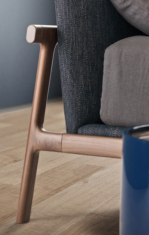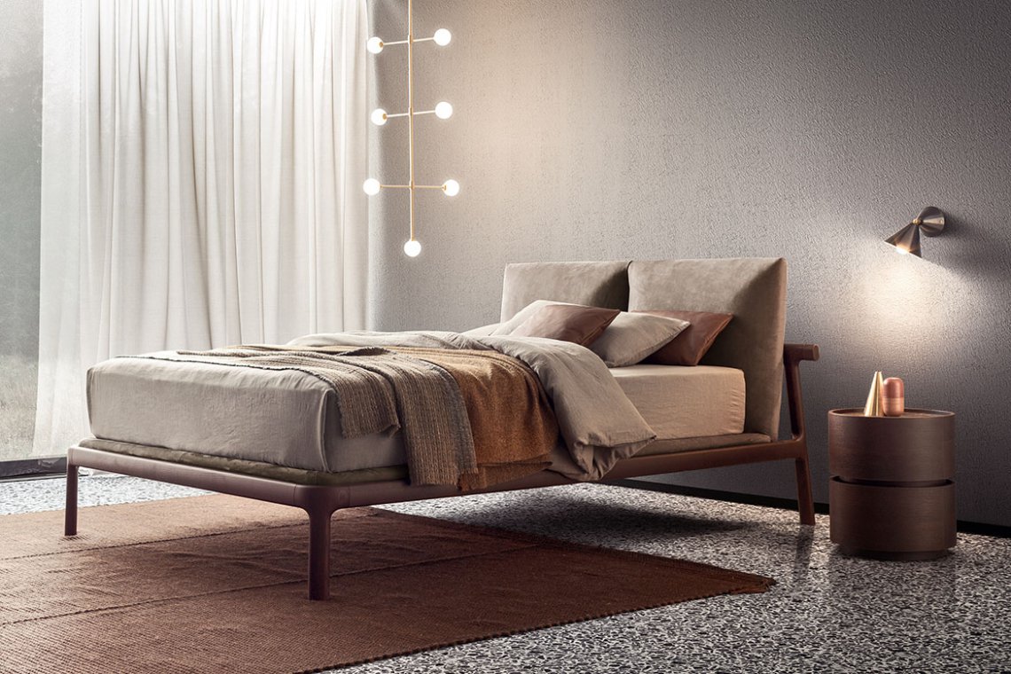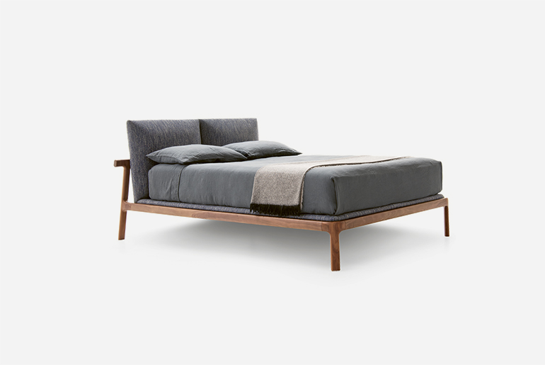 Harmony, balance and light-looking frames are inspired by the Japanese culture. Minimalist, elegant lines design an understated yet evocative bed. Solid ash or walnut wood is elaborately processed. Milled and turned with the skill of a craftsman, it becomes perfectly smooth and rounded. The headboard and the mattress base – that contains a structural base consisting of curved beech beech wood slats – are padded and upholstered.