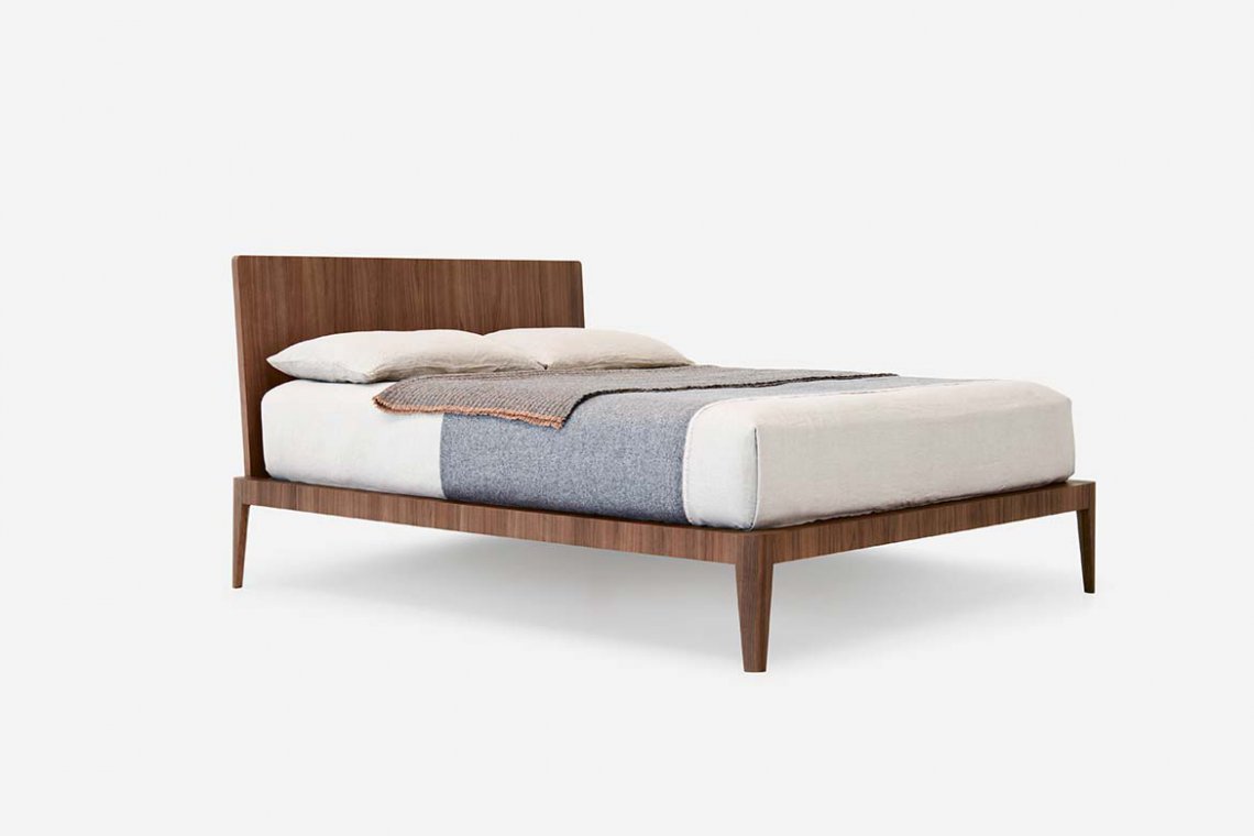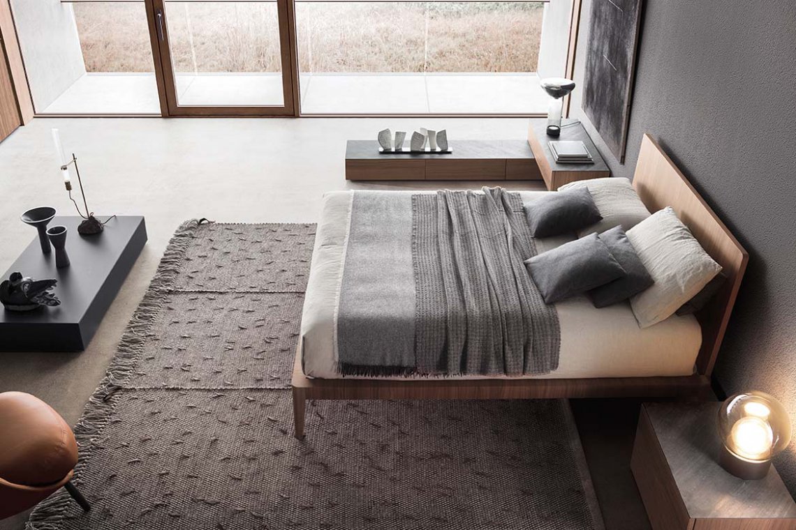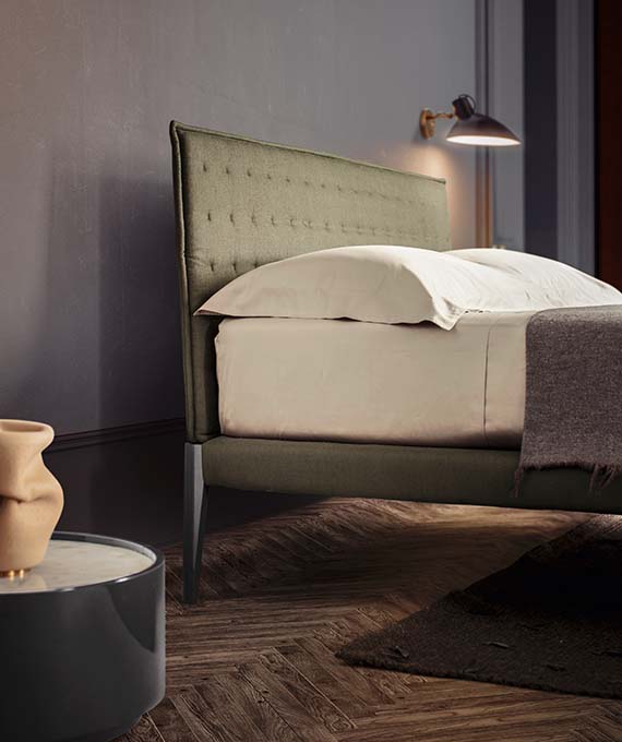 Symmetry and simplicity create a reassuring yet eclectic design. Clean-cut volumes, seamless surfaces, slim and rounded profiles are part of an expressive language that communicates solidity and modernity. The feet, resembling elegant, slim heels, become fascinating distinctive features. For a warmer, more sophisticated version, the headboard and bed frame can be upholstered in fabric or leather. Even the bed’s frame can be customised in many ways: it is available matt lacquered as well as in wood.