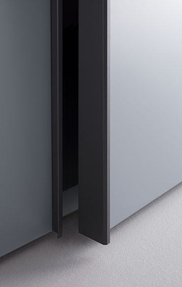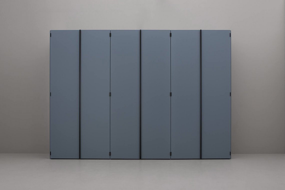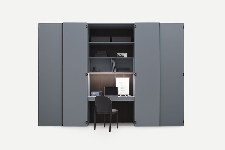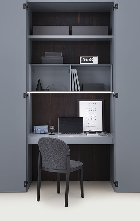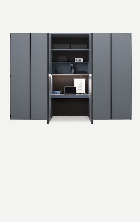 Like a treasure chest, the Amalfi wardrobe opens up to reveal its inner secrets. Not just clothes and shelves, but a home office niche for an unexpected, intimate workspace solution. The Ala desk with drawers, the shelves and open modules create a functional, compact workspace, discreetly stowed away behind doors that conceal forms and functions. Clever little details of cabinet-making brilliance, smart use of hidden lighting and integration of the most modern solutions for office space, make Amalfi the perfect aid for interpreting the fluidity of life right now, rather than a hybrid of different genres. Full length door handles, coordinated or contrasting with the door, enhance the linear geometric wardrobe design. Besides the classic opening styles, Amalfi is available with a special hinge for 180° door opening, recalling the hinges on doors and fine furniture in past times.