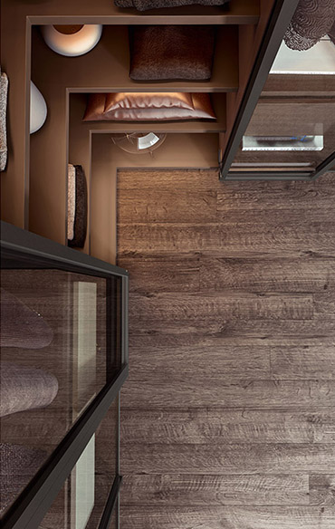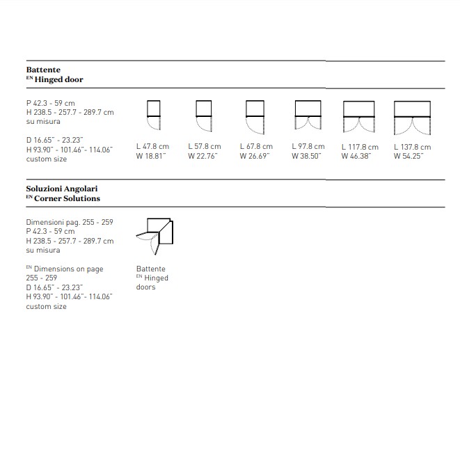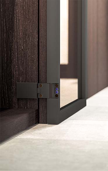 Just as if they were arranged in a personal boutique, your objects and garments must be enhanced and exhibited with elegance and order. The glass doors, defined by a Gunmetal Grey or metallized brown frame, set off and add a finishing touch to arrangements. The visible interior accessories show off their great ability to efficiently organise spaces with style. The hinged doors come with special pivot hinges that can open at a 180° angle.