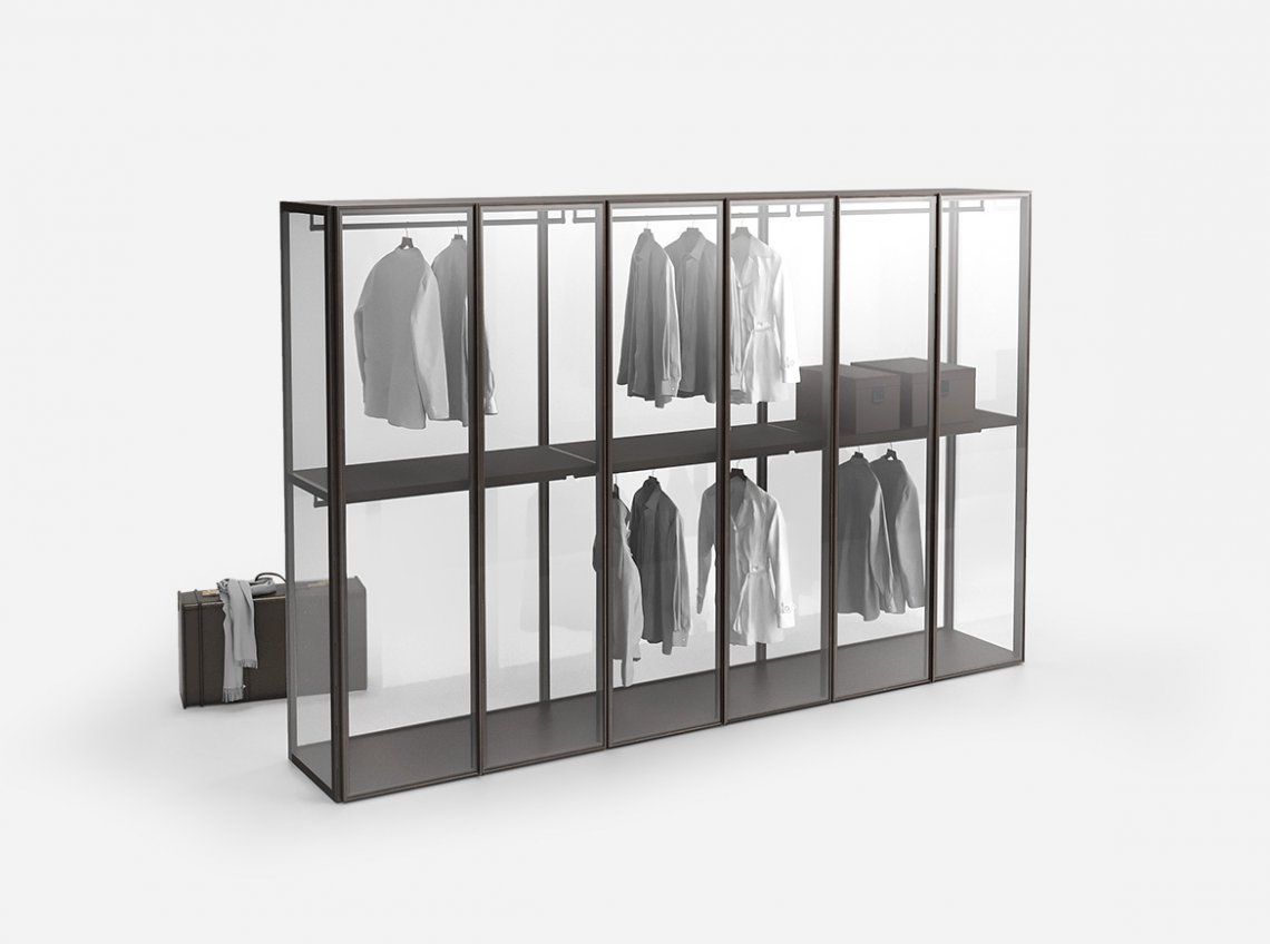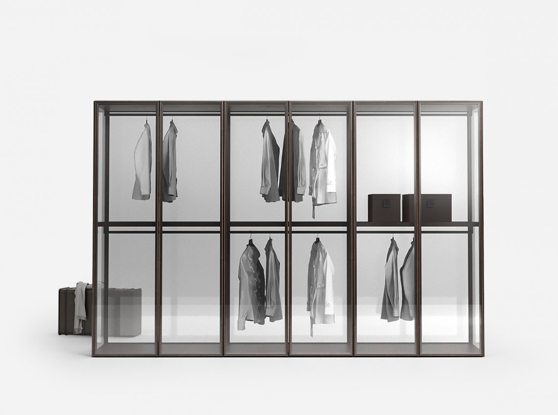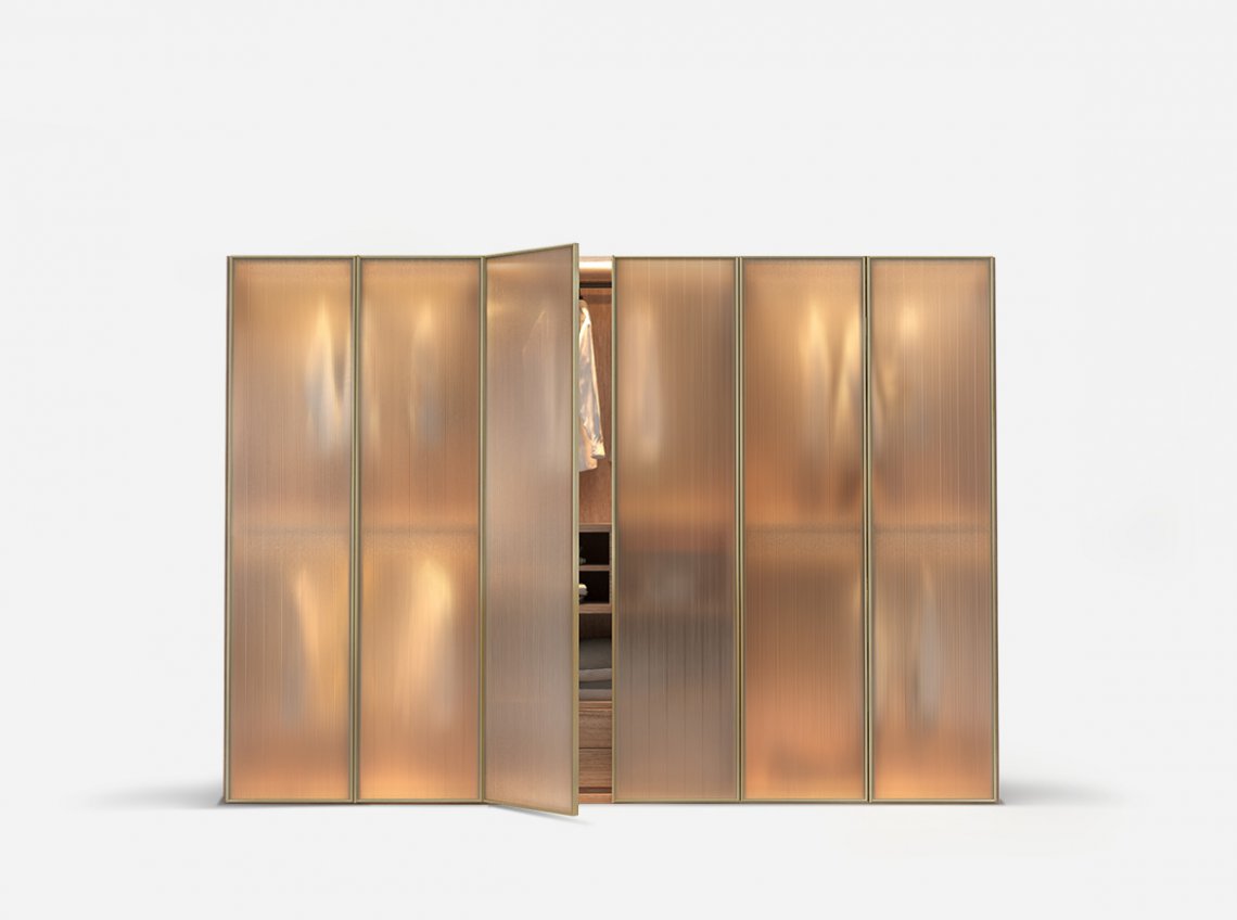 Flowing surfaces, as simple as the material they are made of. The collection of Pianca door front is enriched by Murano, a homage to the timeless appeal of Murano glass. The perimeter frame of the front is designed to resemble the frame of a work of art: the chamfered edge frames the front discreetly, with understated beauty, enhancing without imposing on the style. Glass thus remains the absolute protagonist of subtle contemporary bedroom furniture. The Murano door, available in transparent or reeded glass, can be used with the new Teatro and Sipario walkin closets.