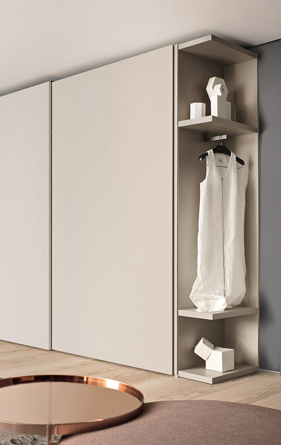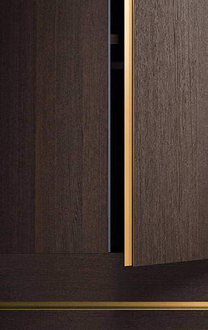 The understated and delicate style of simplicity meets the ultimate in expressiveness and customisation. Nastro offers a vast range of finishes and special solutions to satisfy any aesthetic or functional request: external drawer unit module, bridging module, unit installed above doors, TV unit, open end unit as well as custom-sized solutions. Recessed in the doors, the aluminium, full-height handles draw channels in lacquered colours or in shiny metal finishes.