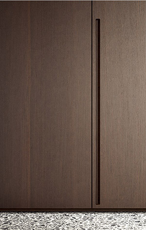 Aesthetic minimalism and functionality are an unbeatable combo. This wardrobe’s success lies in its consistent simplicity and in the power of its minimal lines. Tratto integrates and blends the door parts while carving the handle out of the panel. Vertically recessed near the edge of the door, it offers a sound grip on both hinged and sliding doors. Surfaces feature uniform materials available in all the lacquers and wood types of the collection.