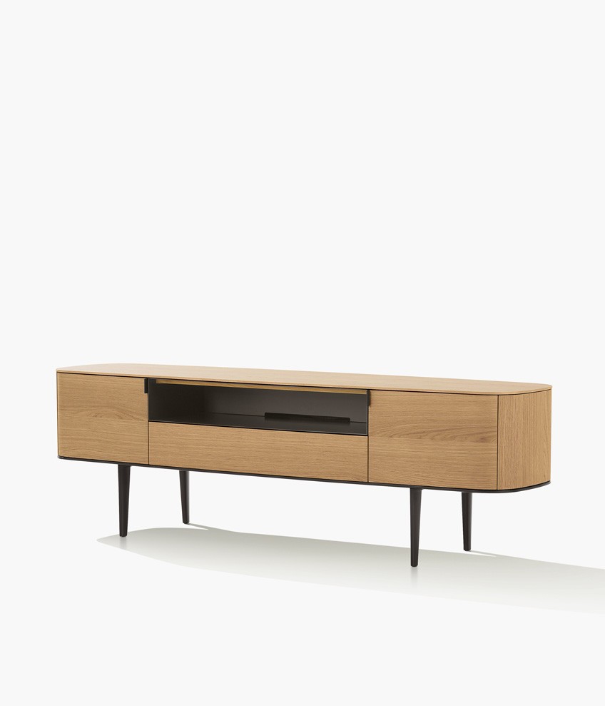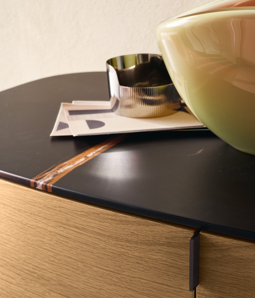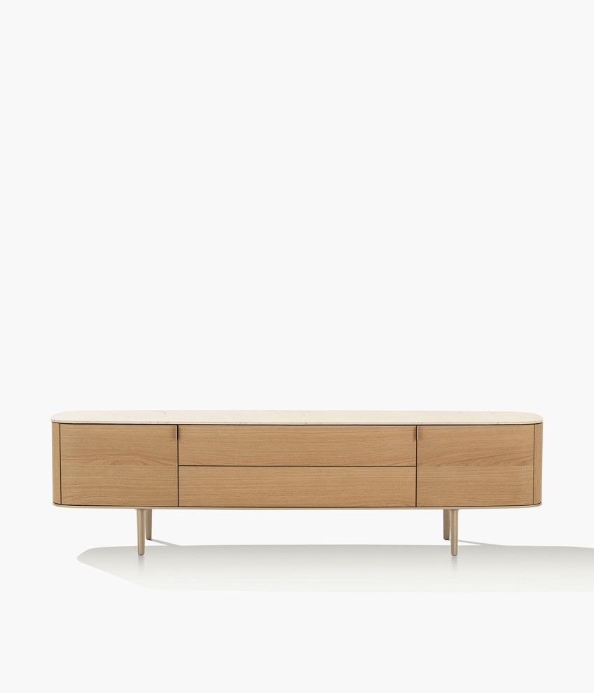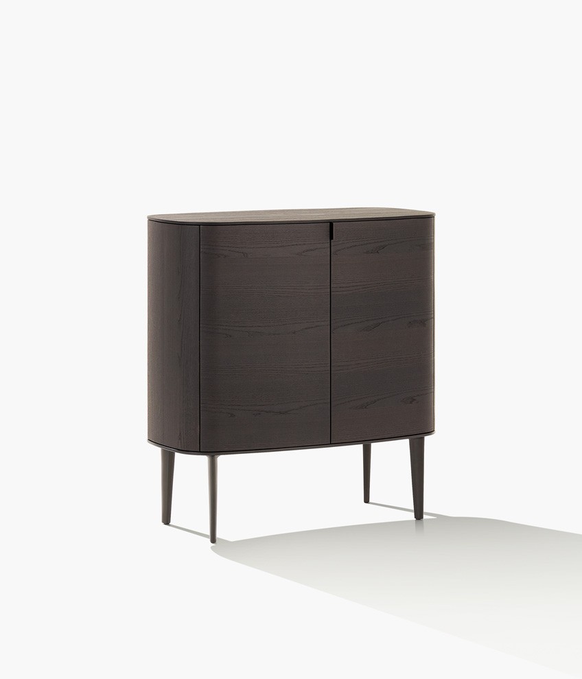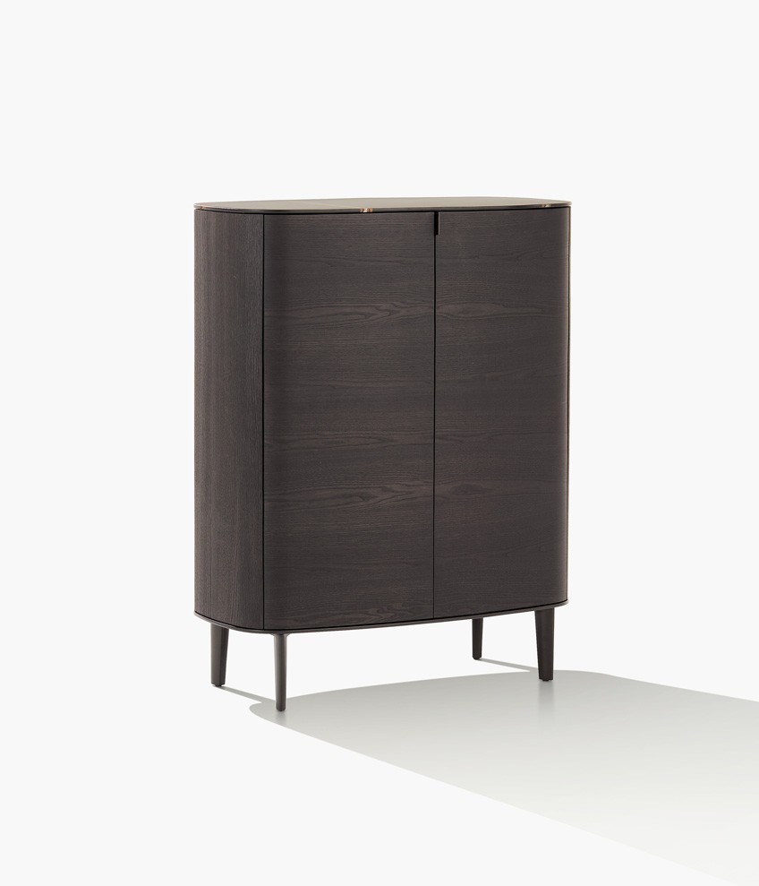 Symphony是一套櫥柜系列,尊貴的材料和精準的工藝體現(xiàn)出了線條之美的精髓。櫥柜以橢圓造型為特色,木飾面更突出了外觀美感。系列產(chǎn)品包含高度和尺寸各異的附件,從高、中款式的柜門,到搭配多個或單個抽屜和開放式隔層的低尺寸款式,均安置在帶支撐腳的底座上。