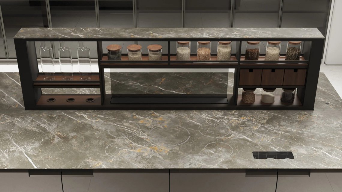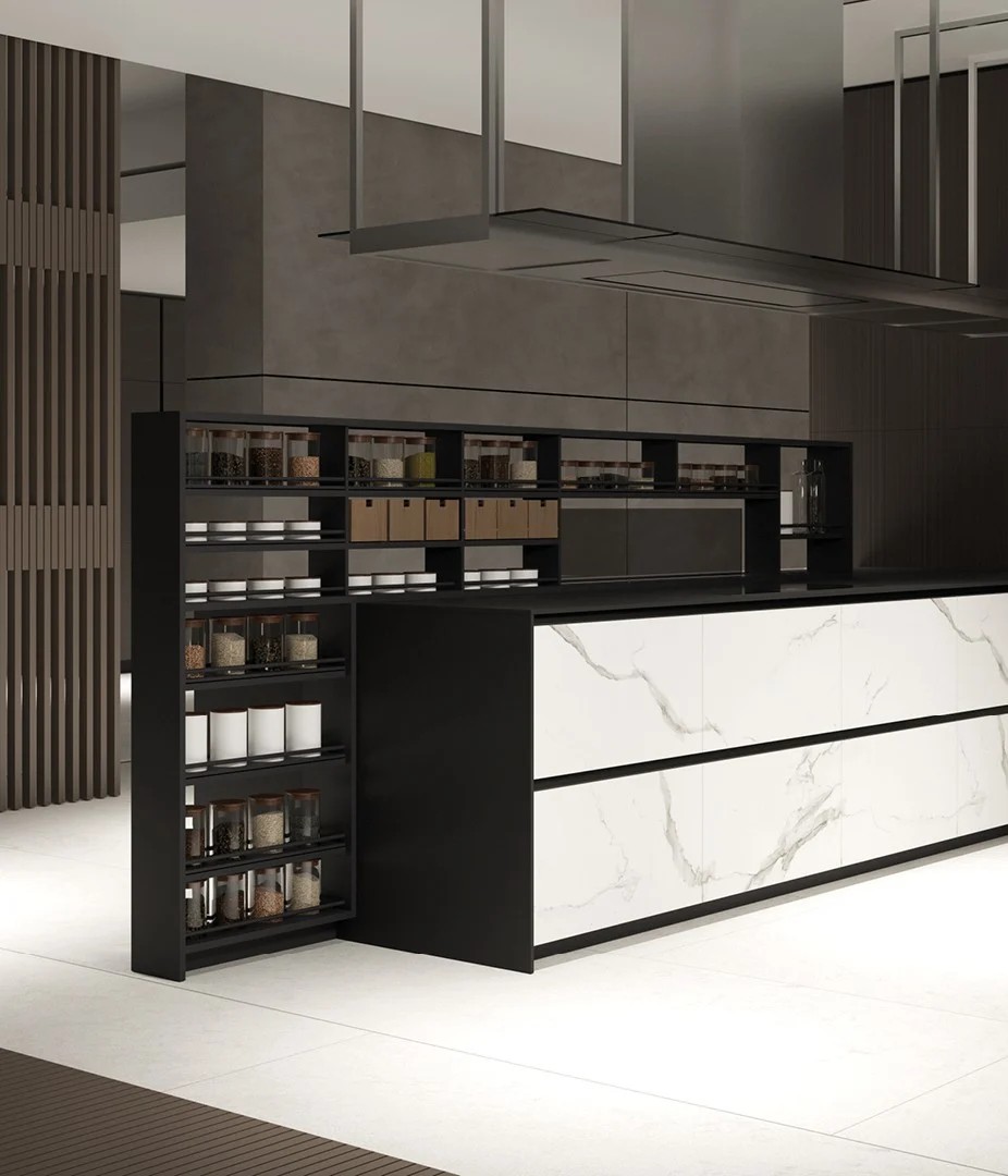 Poliform re-interprets the model Artex in the details in the light of a more contemporary and enticing aesthetics. Thus Artex Pro is born, a kitchen with well-marked lines where the tapered edges are sharper and deeper thus of more lightweight. The thicker worktop looks like floating on the base units. Conceived as complete system, Artex Pro is capable of making the operational area coexist with the dining area. The kitchen is completed with the homonymous system of cupboards that intersect with its volumes.