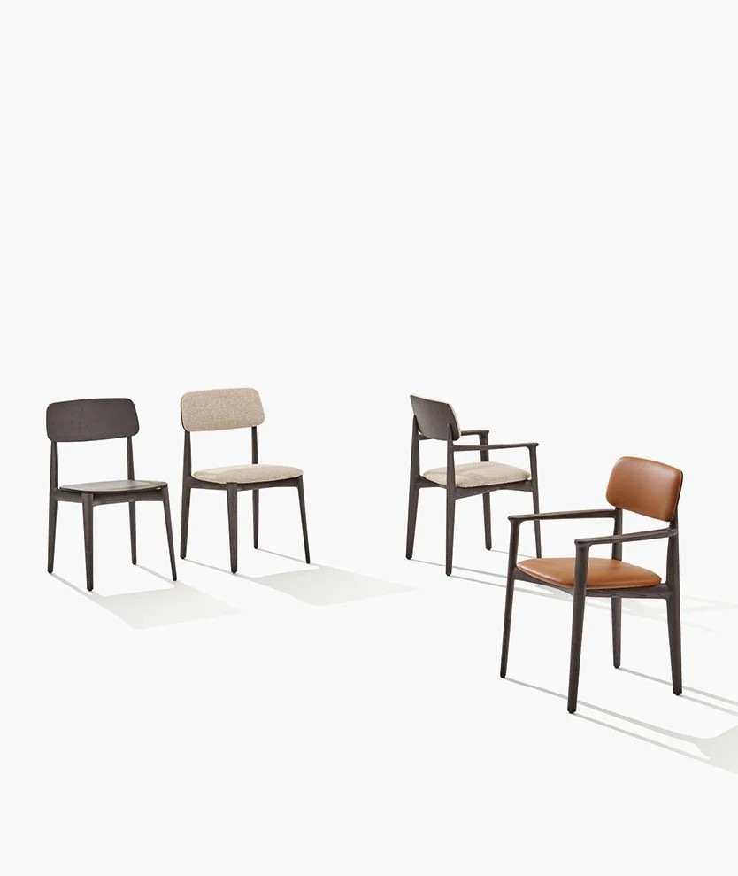 Light and elegant, behind its apparent simplicity this chair hides an intricate crafting of solid wood. In all three variants—wood, wood with upholstered seat and wood with upholstered seat and backrest—the material is the protagonist. Soft curves and tapering slender lines are inspired by modern design. The result is a classic yet contemporary chair, ideally combined with the table by the same name.