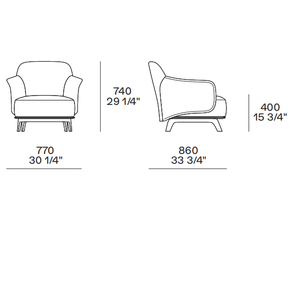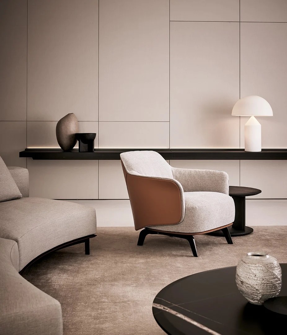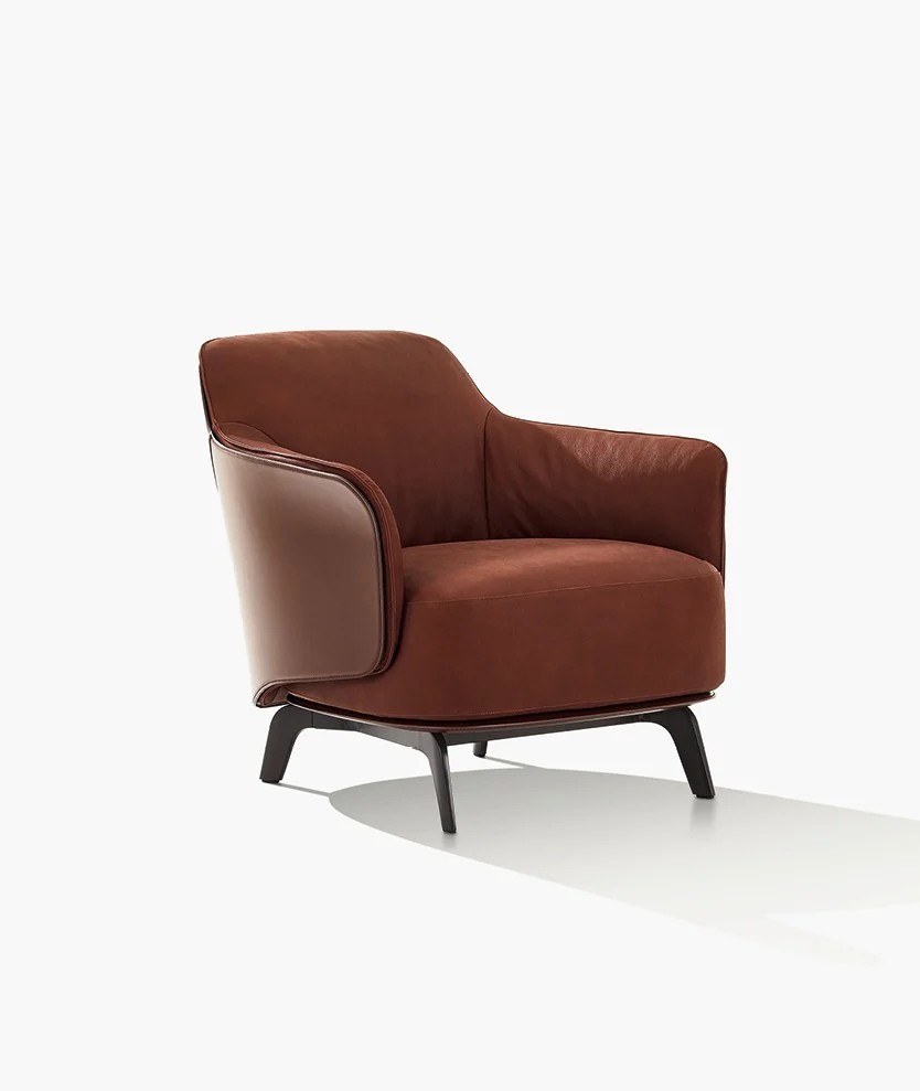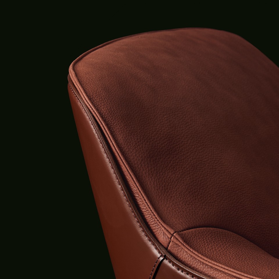 Elegant and sophisticated, the armchair is made up of two perfectly integrated shells—the outer one in leather, the inner one softly padded and upholstered in fabric or leather. Its visual appeal is matched by that of the seat, designed for maximum comfort.