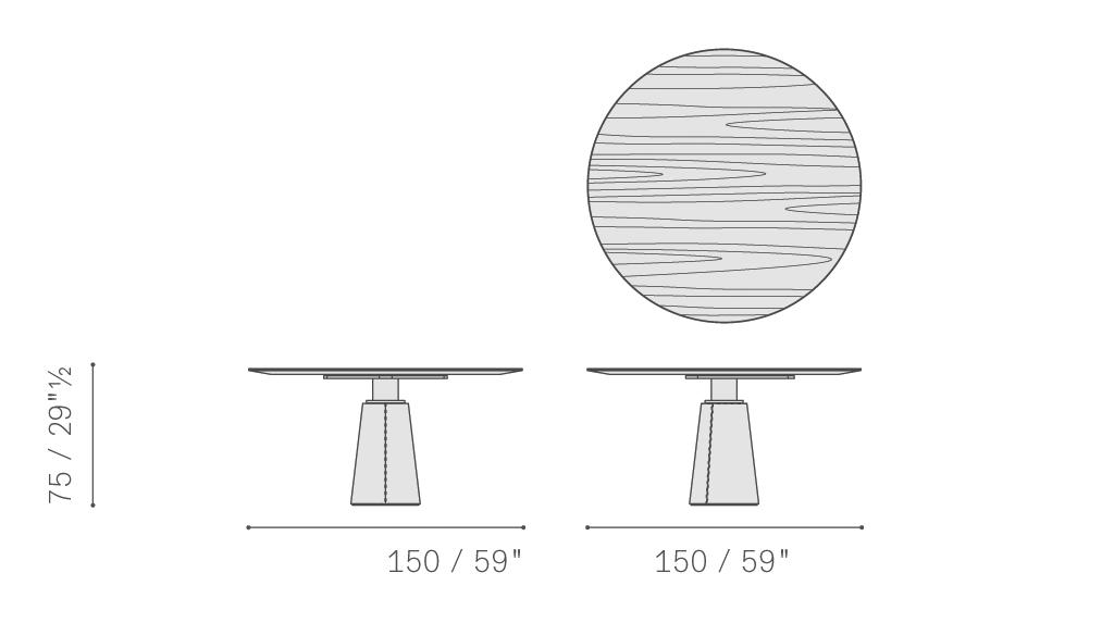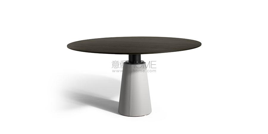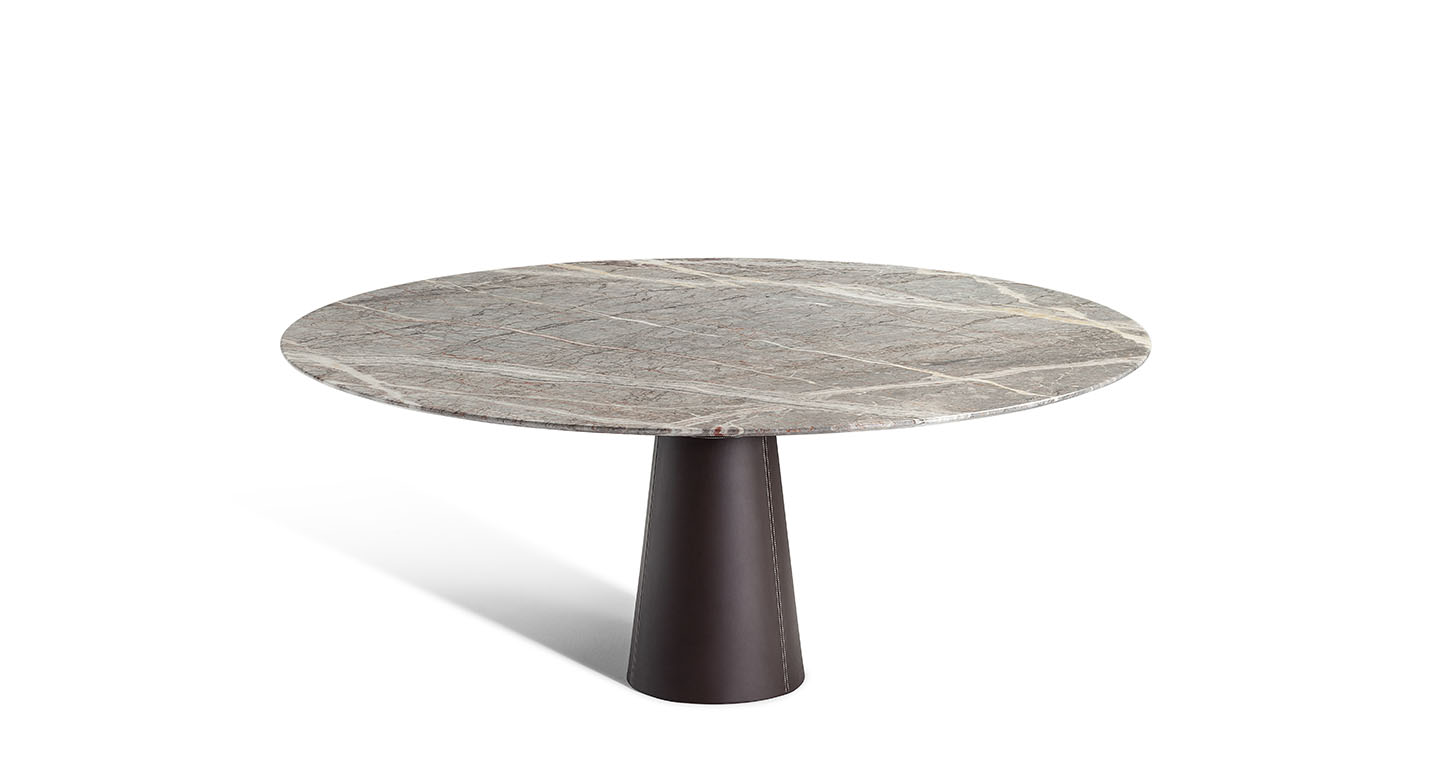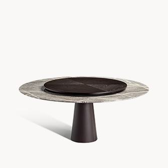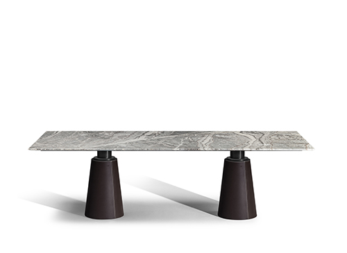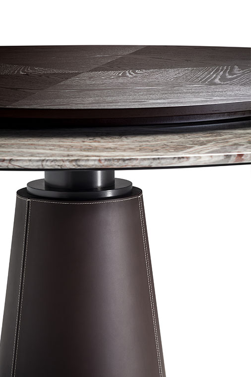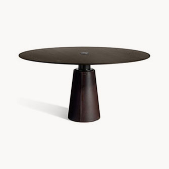 直徑135厘米的Mesa款式使用板巖桌面和塞茵那石支柱,此外還有其它尺寸,擴(kuò)展用途,并發(fā)展為Mesa Due款式:直徑150厘米的午餐桌、直徑120厘米的便餐桌。桌面使用中密度木質(zhì)纖維,鑲貼雞翅木色或摩卡色梣木片,或覆蓋Pelle Frau?軟皮。Mesa Due基座可以為灰色塞茵那石或鋼材,后者覆蓋Cuoio Saddle Extra皮革并使用對(duì)比色縫線,或Pelle Frau? Color System軟皮并使用同色深淺縫線。鋼制底座通過特殊的內(nèi)部配重系統(tǒng)保持穩(wěn)定性,端部具有塑料塑形包頭,用于保護(hù)地板。桌面和支柱之間的連接為棕黑漆鋼管,支撐一個(gè)三臂交叉支桿,配有調(diào)節(jié)支架用于桌面調(diào)平。