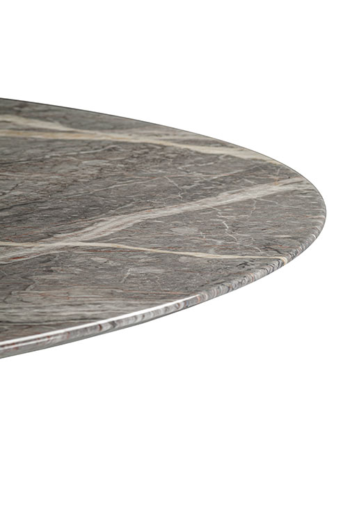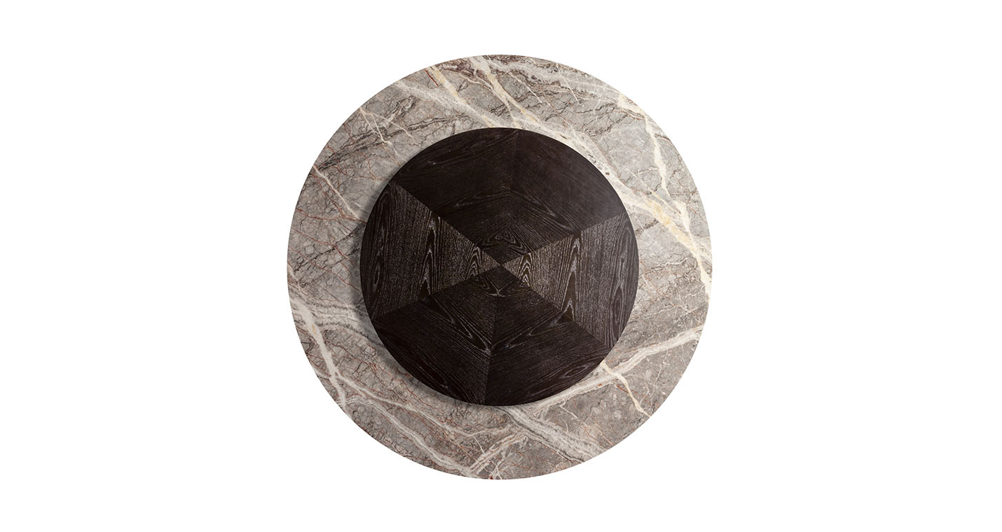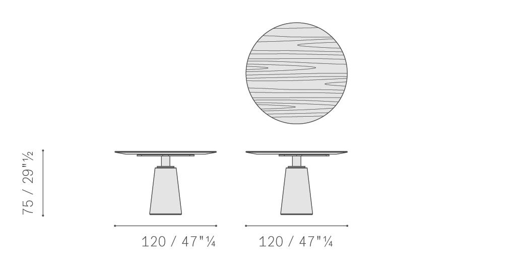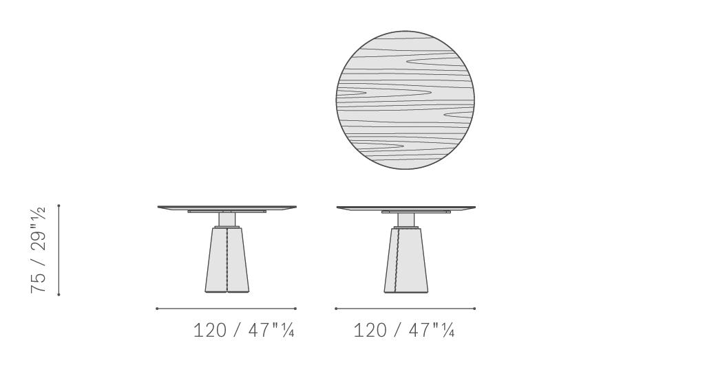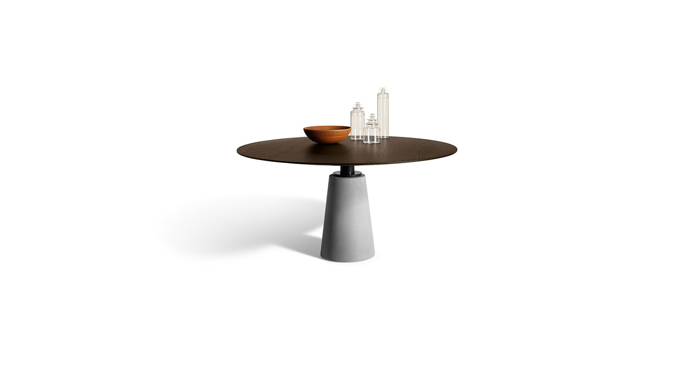 直徑135厘米的Mesa款式使用板巖桌面和塞茵那石支柱,此外還有其它尺寸,擴(kuò)展用途,并發(fā)展為Mesa Due款式:直徑150厘米的午餐桌、直徑120厘米的便餐桌。桌面使用中密度木質(zhì)纖維,鑲貼雞翅木色或摩卡色梣木片,或覆蓋Pelle Frau?軟皮。Mesa Due基座可以為灰色塞茵那石或鋼材,后者覆蓋Cuoio Saddle Extra皮革并使用對(duì)比色縫線,或Pelle Frau? Color System軟皮并使用同色深淺縫線。鋼制底座通過特殊的內(nèi)部配重系統(tǒng)保持穩(wěn)定性,端部具有塑料塑形包頭,用于保護(hù)地板。桌面和支柱之間的連接為棕黑漆鋼管,支撐一個(gè)三臂交叉支桿,配有調(diào)節(jié)支架用于桌面調(diào)平。