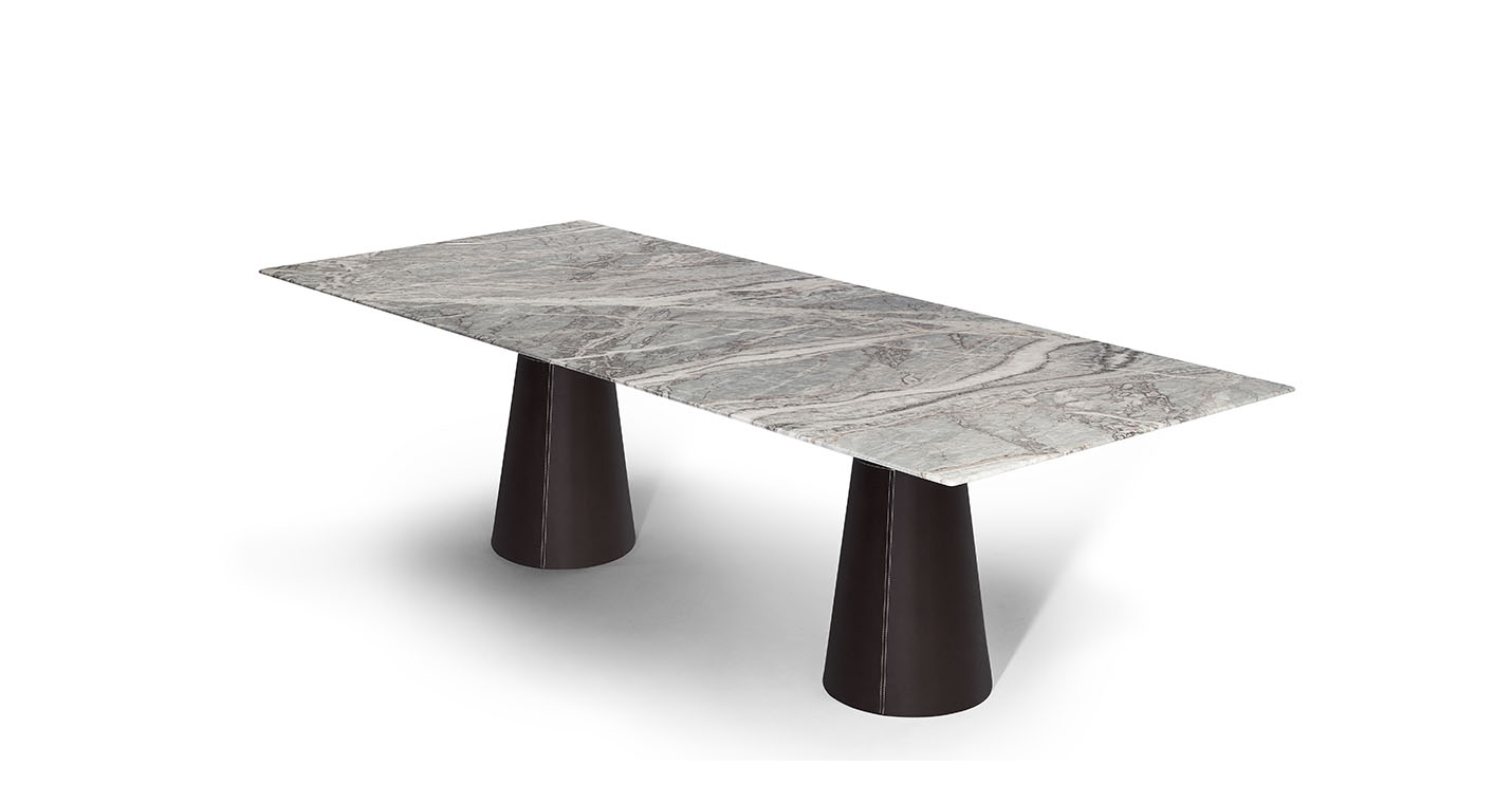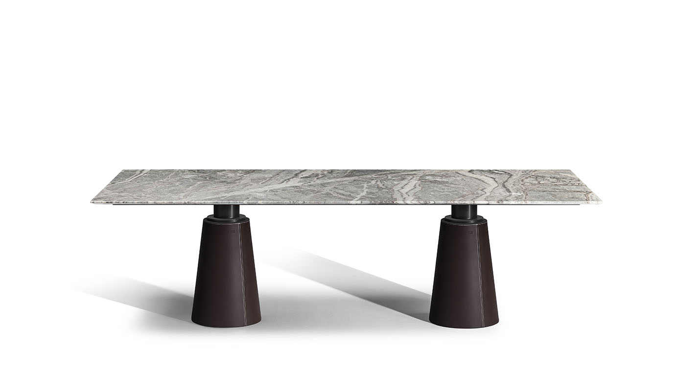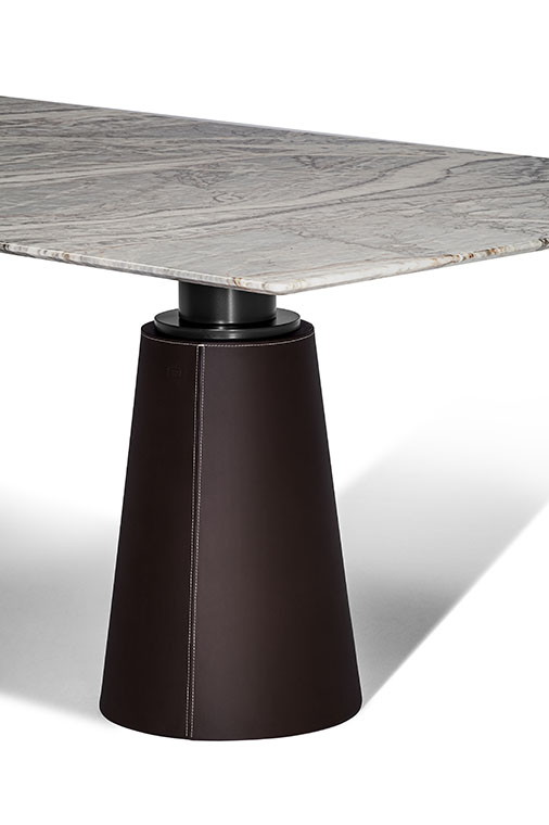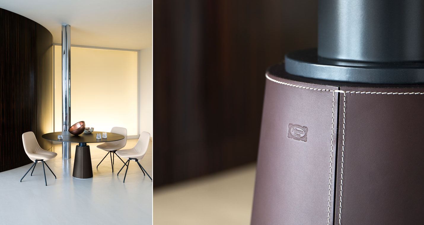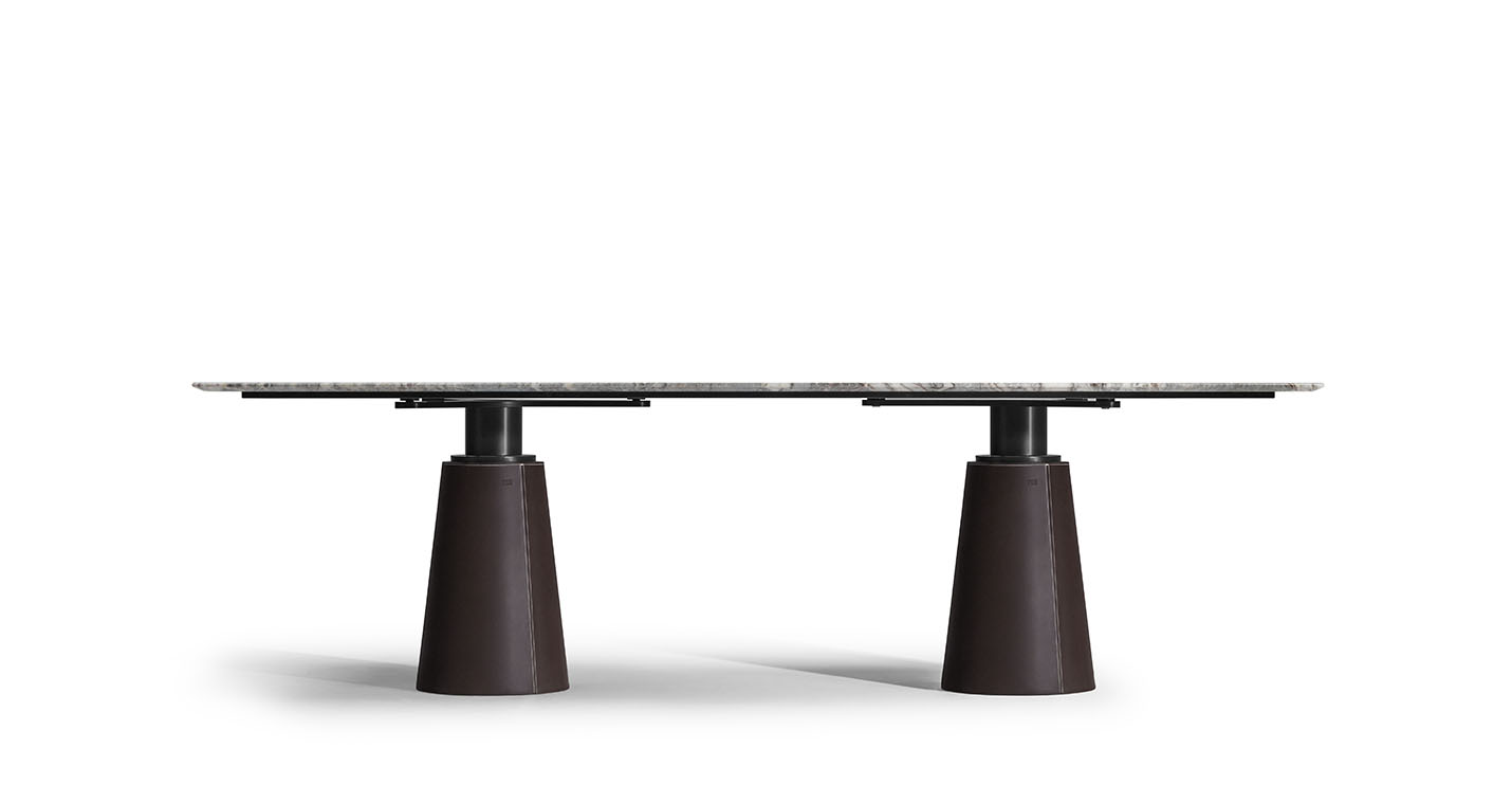Mesa Due餐桌采用軟皮和皮革支桿,可以安裝電動(dòng)伸縮塔柱,由客戶在購買時(shí)選擇和指定。