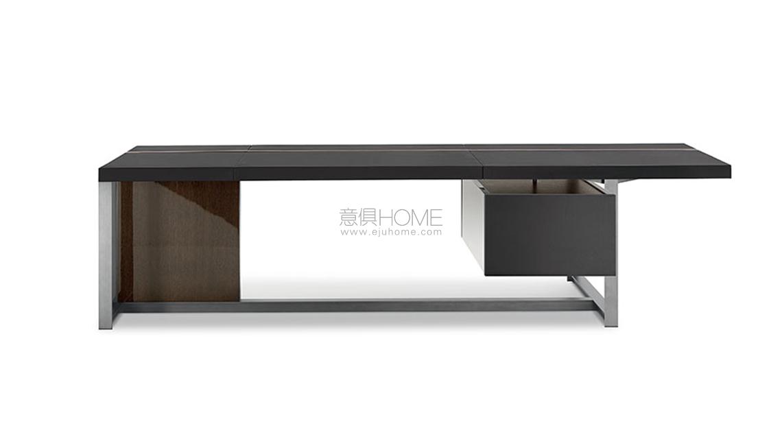 Jobs President Desk寫字臺桌面覆蓋Pelle Frau?軟皮,搭配鉛色或煙草色無梗花櫟木條,整個長度上使用啞光表面處理,將工作區域和“客戶區域”分開。“客戶區域”可以覆蓋Pelle Frau?軟皮,與桌面其他部分相搭配,或使用鉛色或煙草色啞光無梗花櫟木貼面,與支桿或收納柜相搭配。桌面也配有滑門,可以露出一個小型內部隔槽,與筆架托盤相連,也可方便走線。