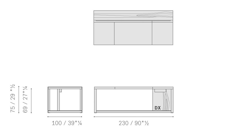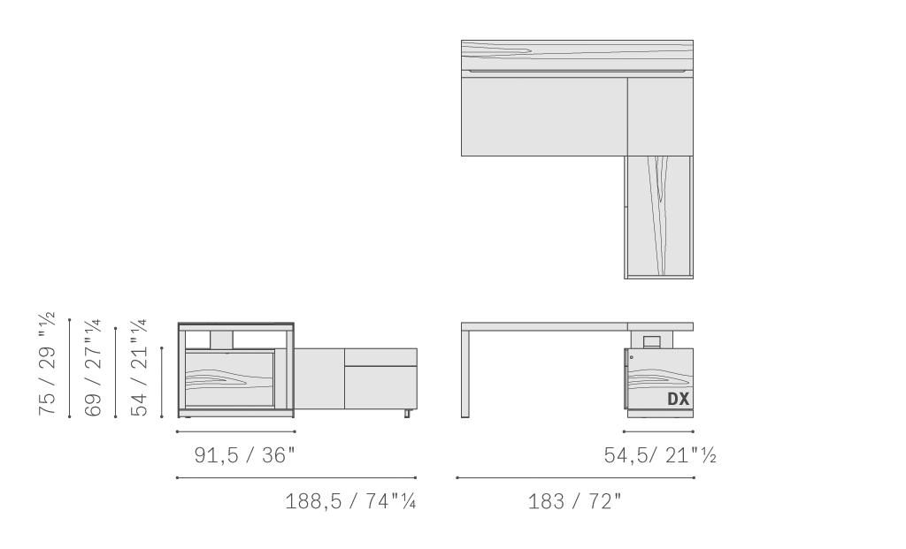 為了更好的回應靈活和當代工作空間的需求,Jobs寫字臺提供不同尺寸:President和Executive Desk分為標準、大號和72”版本。Easy Desk分為標準和大號版本。桌面與收納柜相結合,后者通過走線管與寫字臺相連。Jobs Presidente Desk的抽屜柜配備一個外露隔槽和兩個抽屜。Jobs Executive Desk配有懸掛收納柜,由兩個抽屜和一個分類區構成。抽屜和文件分類柜均配備緩沖歸位裝置,面板覆蓋Pelle Frau?軟皮。兩個收納柜的結構均采用特色“T”型橫截面鉛色噴漆磨砂鋼以及中密度木質纖維,使用鉛色或煙草色拋光表面處理無梗花櫟木貼面。