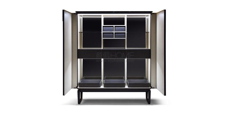 在設計Fidelio系列(低柜、高柜、吧臺柜)時,Roberto Lazzeroni特意選擇干練的設計,與珍貴材料相結合:精簡的形狀與考究的材料做工帶來一個跨空間系列,能夠輕松搭配Poltrona Frau的其它家具。功能細節(jié)成為極具個性的美學元素,例如開槽式拉手,好似在表面上繪制的圖形。皮革熱情深沉的色調與外表木材形成強烈對比,隔槽中露出的超淺色天然楓木帶來明亮的視覺沖擊。