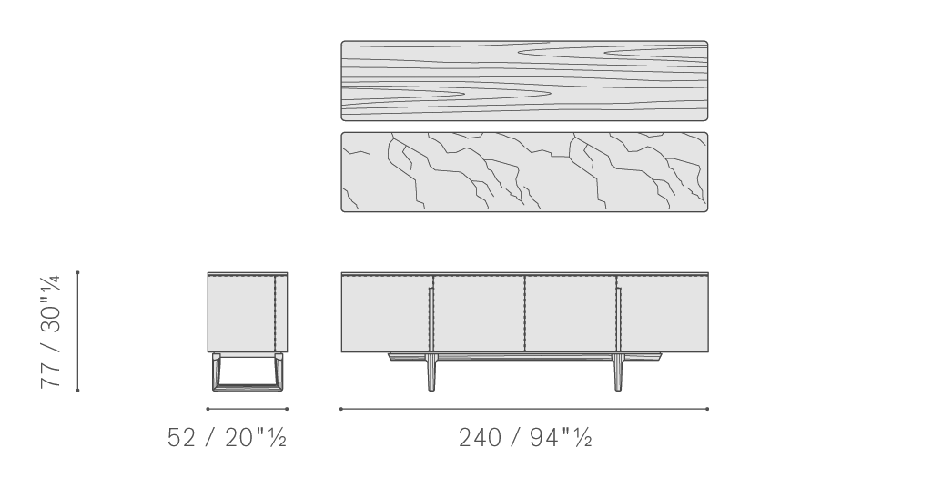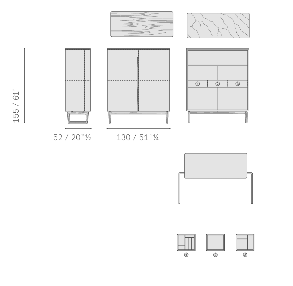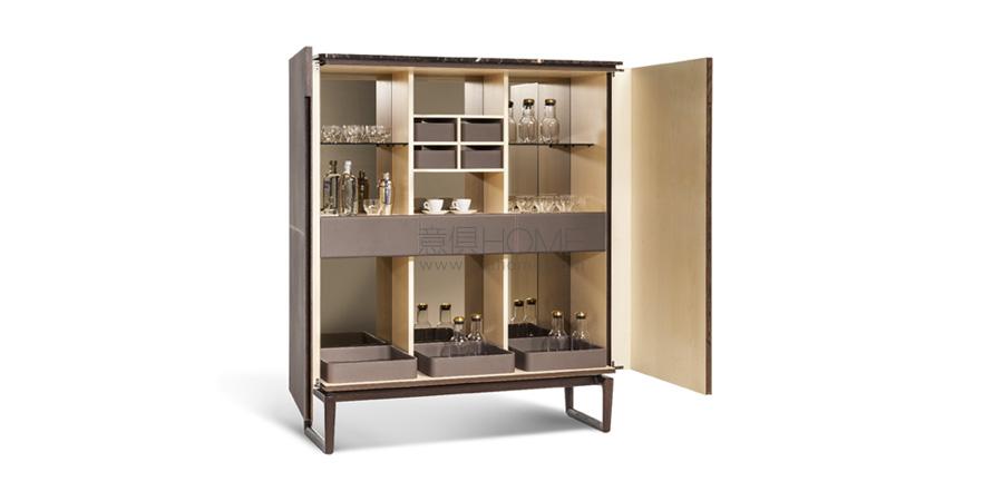 該系列包括低柜、高柜和Fidelio吧臺柜。支撐結構使用梣木實木和樺木膠合板,外側鑲貼摩卡色梣木。超淺色天然楓木令內部更加明亮。門板內部使用鑲貼樺木和楊木膠合板,F(xiàn)idelio低柜使用摩卡色梣木,F(xiàn)idelio高柜使用超淺色天然楓木片材。小門邊緣使用摩卡梣木實木。頂板可以使用摩卡色梣木、拋光或半拋光Calacatta Oro(卡拉卡塔金)大理石或拋光Emperador(金峰)大理石。支架式底座使用摩卡色梣木實木,采用三角形截面,彰顯整體上的視覺輕盈感。底座通過啞光黑漆鋼圓柱形五金件固定在結構上。鋼制可調支腳具有橡膠包頭。側面、門板、內部抽屜使用珍貴皮面,柜子后側也可選擇使用皮面。可以使用同色深淺或對比色縫線。Fidelio吧臺柜內部配有門板打開自動照明。柜子后壁板裝有兩塊鍍銅鏡子。