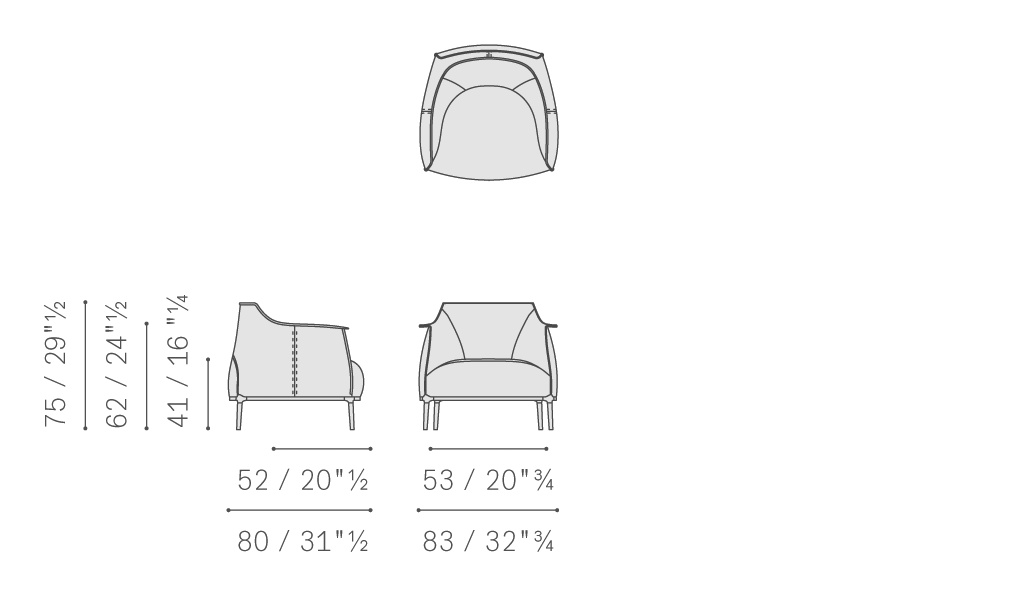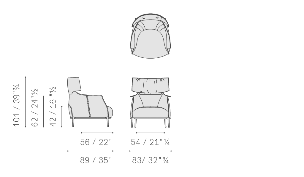 靠背和座椅結(jié)構(gòu)為鋼制,包墊使用印壓成型聚氨酯泡沫和塑形泡沫,需要額外舒適感的部位填充聚酯棉。彈簧結(jié)構(gòu)使用松緊帶。底座由四個(gè)鋁合金支腳構(gòu)成,框架采用槍管色表面處理鋼管。Archibald扶手椅和圓沙發(fā)凳表面覆蓋Pelle Frau?軟皮。