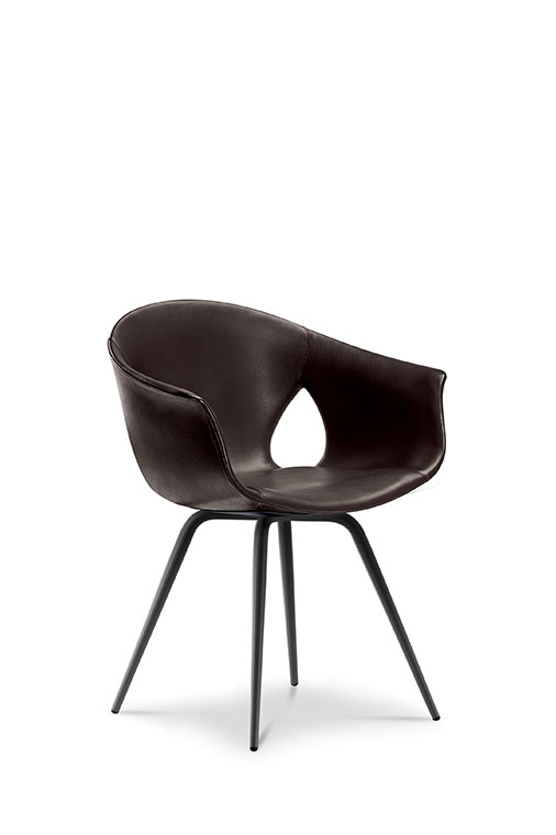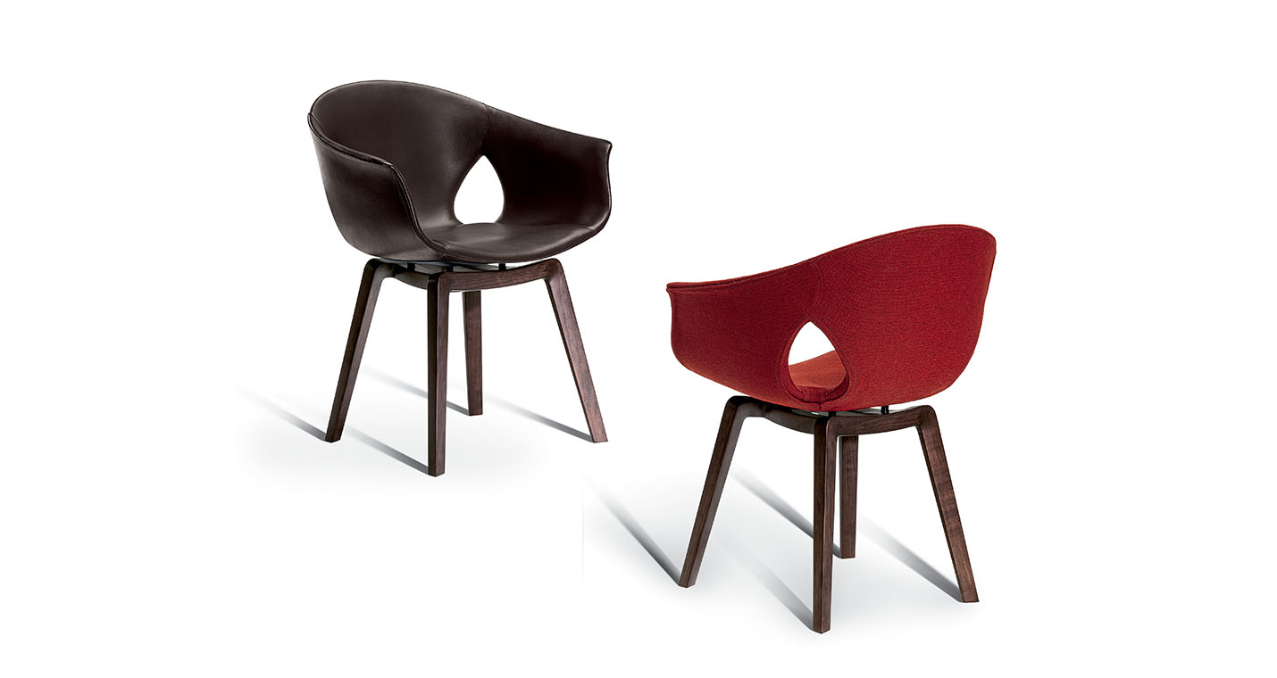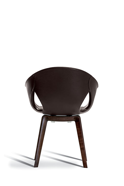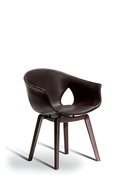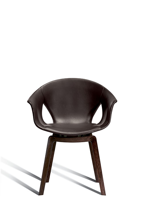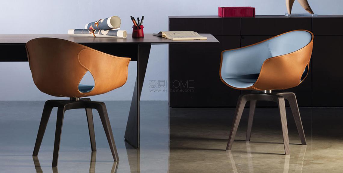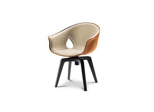 Ginger小扶手椅主體采用印壓成型合成熱塑聚酯。主體與基座之間的固定通過黑漆鋼支架實現。旋轉版本中,可以旋轉360°并回到初始位置。包墊采用聚氨酯泡沫。Ginger外部覆蓋厚度4毫米的無接縫Cuoio Saddle皮革或Saddle Extra皮革。內部覆蓋Pelle Frau?軟皮,具有令人喜愛的材質對比。四支腿底座使用雞翅木色或摩卡色梣木實木,具有三角形截面。