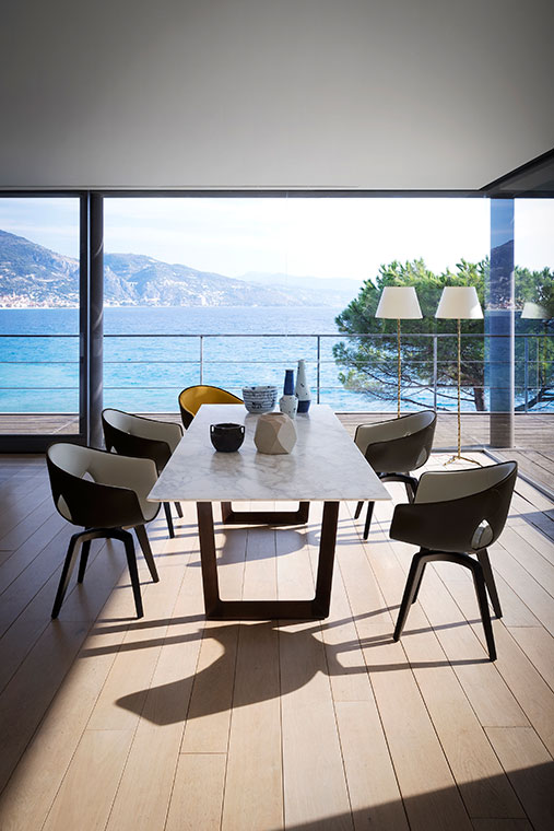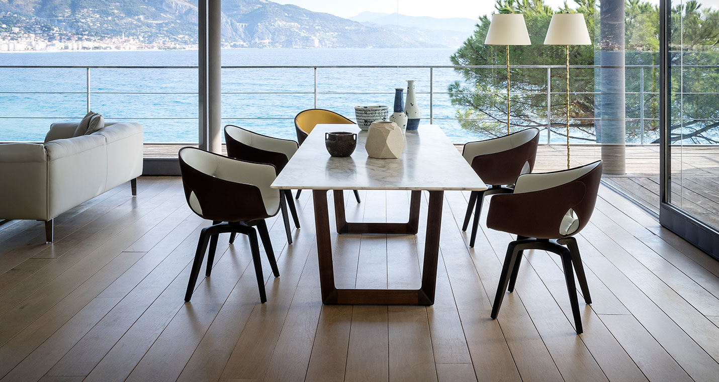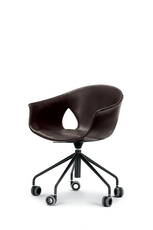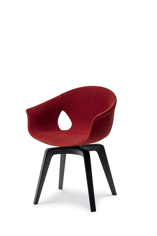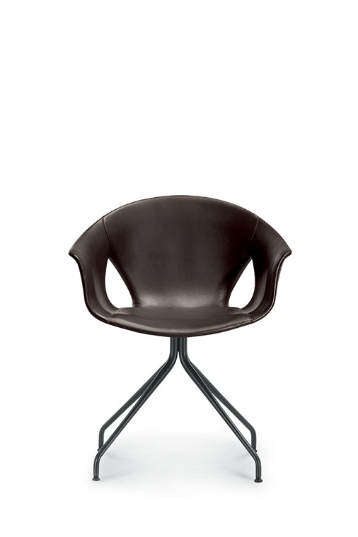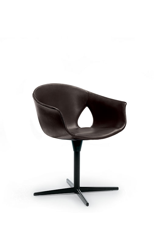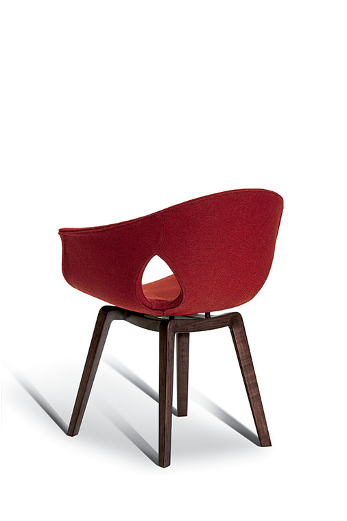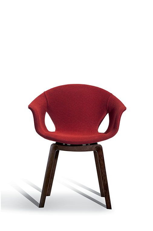 Ginger小扶手椅主體采用印壓成型合成熱塑聚酯。主體與基座之間的固定通過黑漆鋼支架實現。旋轉版本中,可以旋轉360°并回到初始位置。包墊采用聚氨酯泡沫。Ginger外部覆蓋厚度4毫米的無接縫Cuoio Saddle皮革或Saddle Extra皮革。內部覆蓋Pelle Frau?軟皮,具有令人喜愛的材質對比。四支腿底座使用雞翅木色或摩卡色梣木實木,具有三角形截面。