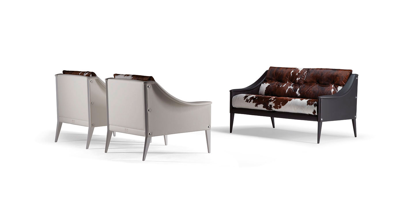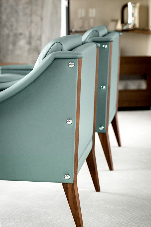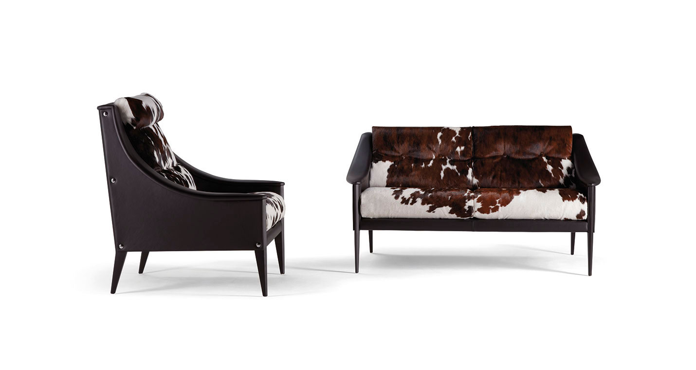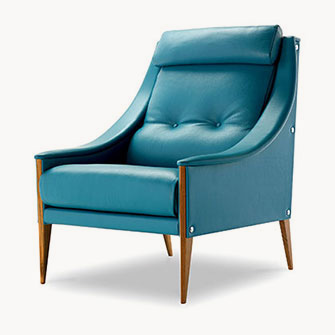 支撐結(jié)構(gòu)采用陳年櫸木。12號(hào)扶手椅采用纖細(xì)扶手,可以將兩個(gè)或多個(gè)組合在一起。48號(hào)扶手椅配有填充鵝絨的頭枕,與靠背結(jié)合在一起。表面完全覆蓋Pelle Frau?軟皮,或者主體使用Pelle Frau?軟皮,坐墊和靠背靠墊使用Cavallino。支腳可以選擇多種表面處理:除了黑色或白色漆繪木之外,還可以選擇Ponti天藍(lán)色或Ponti綠色,或者黑核桃木。