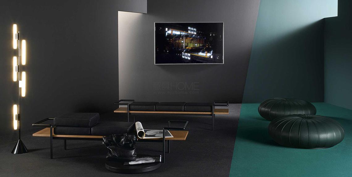 T904長凳結構由黑漆鋼管精準描繪。坐墊極為簡單,桌板采用楊木膠合板,貼面為柚木色梣木,能夠與三個靠墊隨意搭配,簡單地放在木制平面上。靠墊包墊采用聚氨酯泡沫和滌綸填充。表面覆蓋Pelle Frau?軟皮或可拆洗布藝。