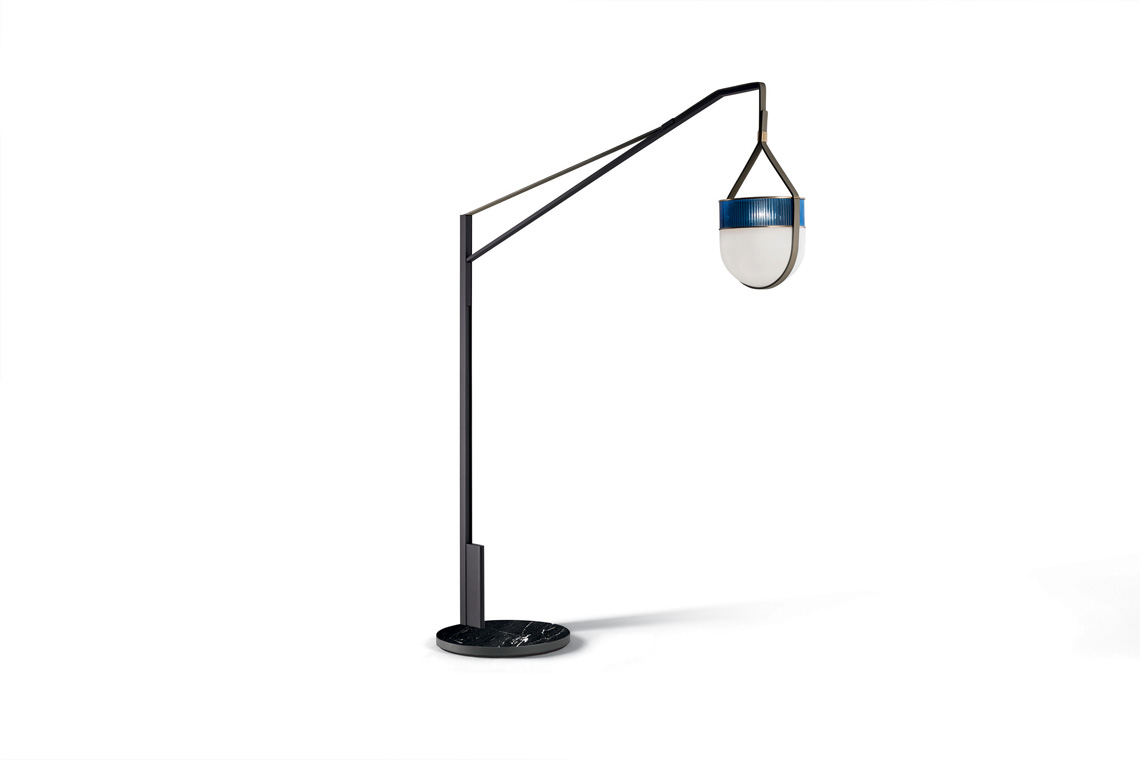 落地式臂燈版本由單一超大懸掛燈籠構成。支承桿為鍍色磨砂鋼。固定發光體的Saddle Extra鞣皮條一直垂到底座處,包裹鋼制支柱后半部分。底座由圓形半拋光馬齊納黑大理石構成,裝有金屬平衡矮基座。大理石基座邊緣有框架。底座的所有金屬細節均采用鍍色磨砂表面處理。