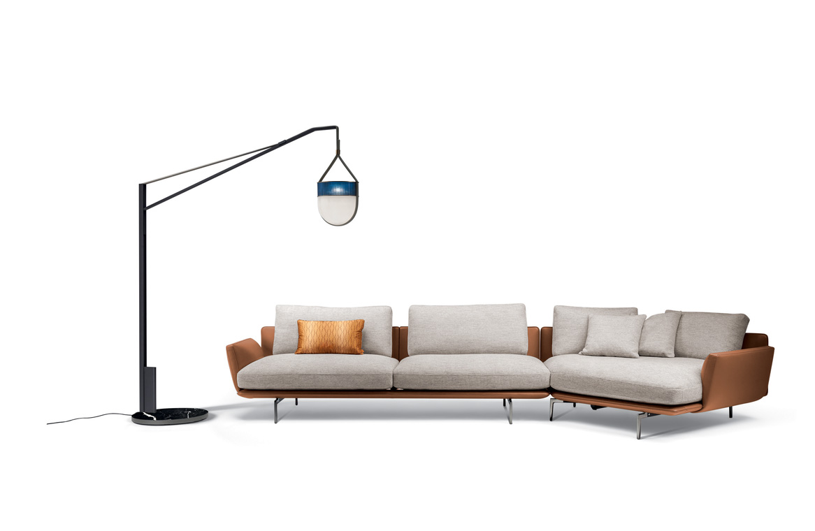 發光體由Saddle Extra鞣皮條支撐,可以選擇Cammello駝色和Talpa深灰色表面處理,邊緣剪裁整齊,同色深淺染色,烙印Poltrona Frau標志。在落地燈和吊燈新版本中,懸掛燈具的鞣皮條以軋光黃銅表面處理金屬袢帶固定。