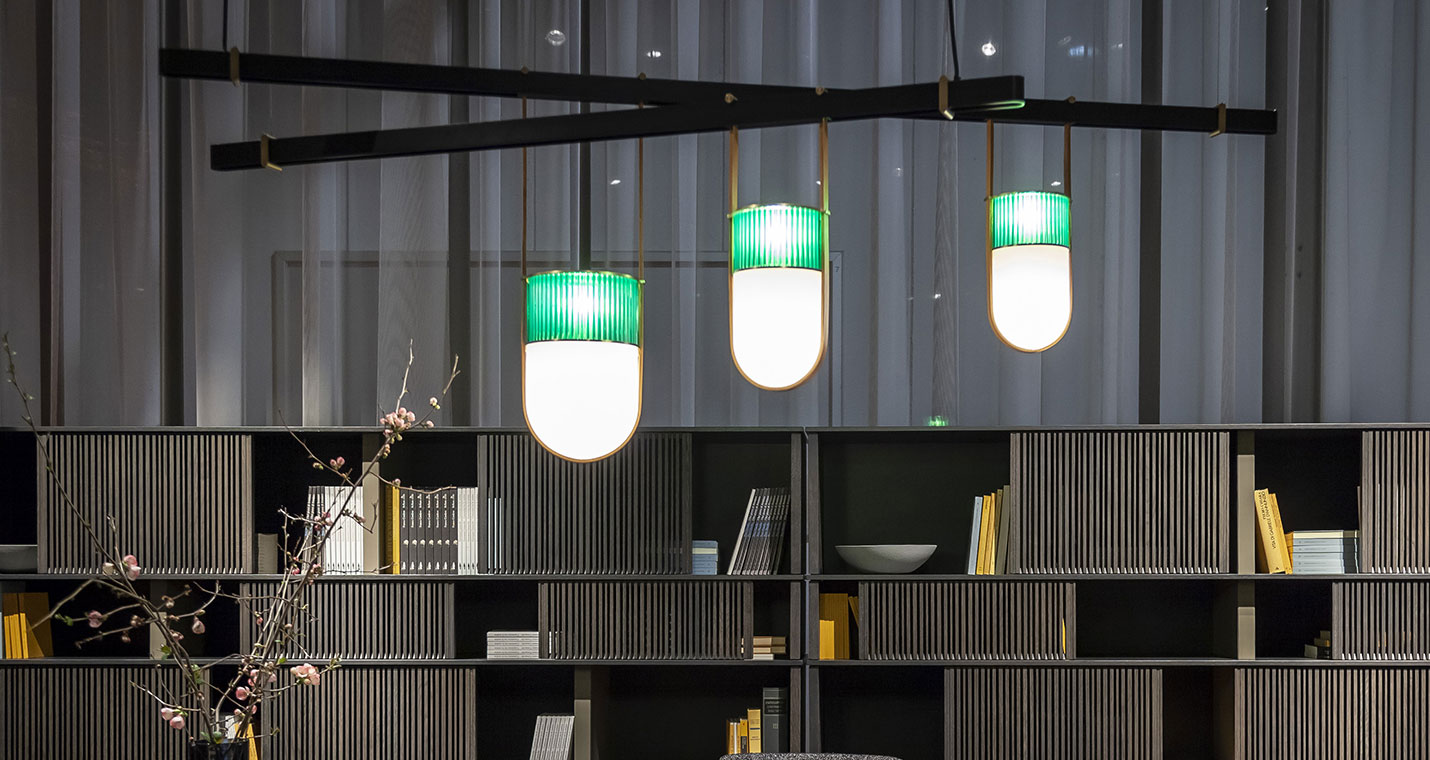 Xi燈具采用吹制玻璃和鞣皮制作,如燈籠般被空間呵護。發光體由兩個吹制玻璃元素構成。上半部分具有特殊的規則而透明羅紋表面,染上琥珀、綠寶石、紅寶石或月光石色。發光體下半部分采用珍珠表面處理,令光線溫暖而分散。這些部件由威尼斯玻璃大師使用彩色玻璃膏吹制而成,每一件均獨一無二。玻璃藝術加工會導致著色深淺差異以及小氣泡,這是產品價值所在,令每一件獨一無二、絕不重復。