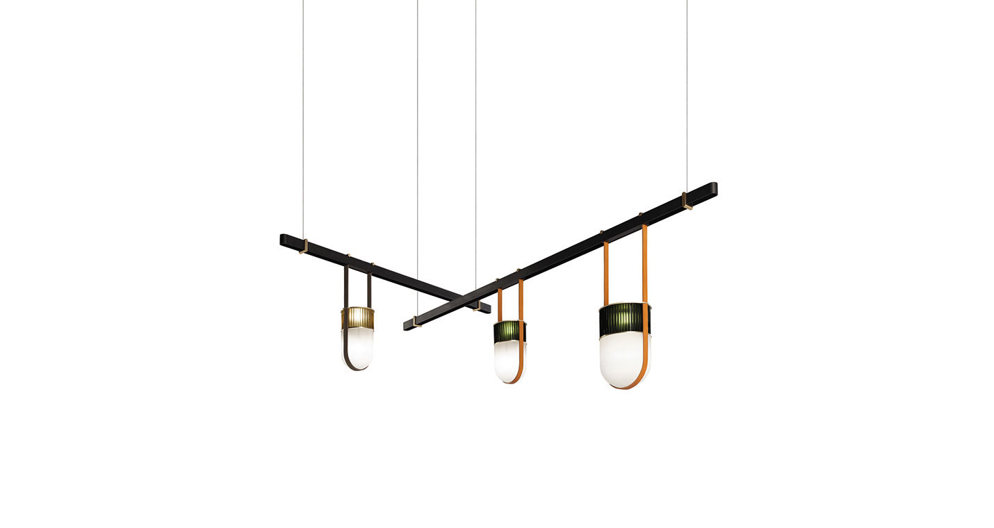 Xi燈具系列包括多款產品:吊燈(搭配或不搭配橫桿)、落地式臂燈以及臺燈。