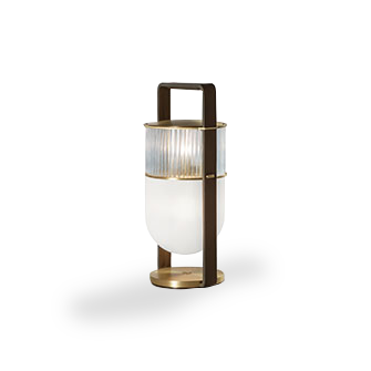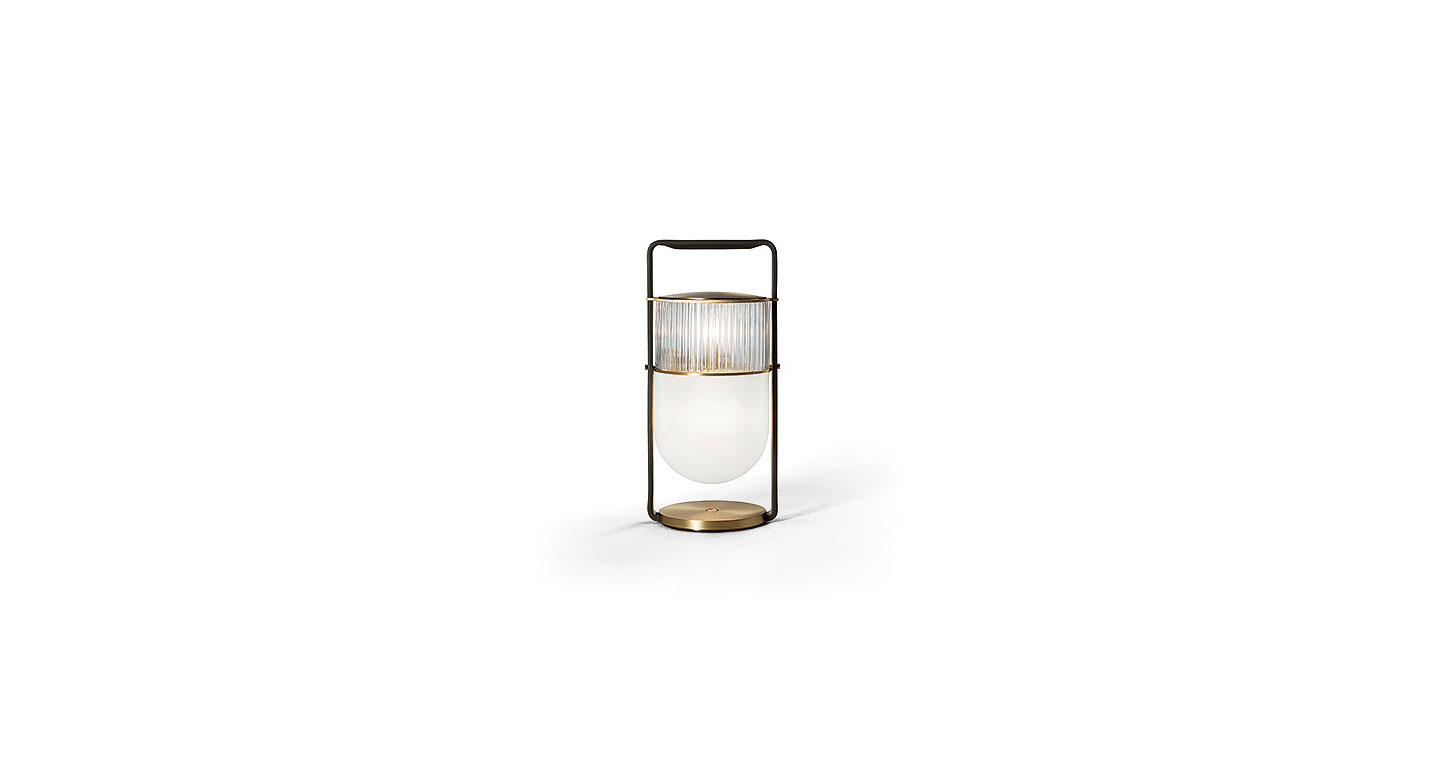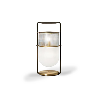 臺燈版本中,發光體好似巨大的燈籠,架在天然黃銅表面處理基座上。Saddle Extra鞣皮條支撐燈具,可以當作扶手移動燈具。可以通過觸摸式明暗開關系統調整光線。