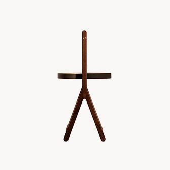 Ren 咖啡桌配有一個托架隔層,由一個有黑胡桃木貼面的樺木膠合板底座和一個包覆鞣制皮革的弧形黃銅框架構成。底部覆蓋一塊 Saddle Extra 鞣制皮革墊。