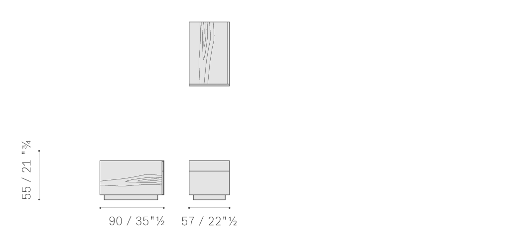 Jobs抽屜柜主體結構使用鉛色或煙草色無梗花櫟木貼面,采用拋光表面處理,頂板采用啞光表面處理。底座使用防刮擦黑色紋理噴漆,配有4個自轉輪。Jobs抽屜柜配有2個抽屜,抽屜面板覆蓋Pelle Frau?軟皮,內部結構使用防刮擦黑色紋理噴漆。抽屜配有唯一的鑰匙鎖,位于右側。Jobs抽屜柜的外露隔槽位于抽屜對側。