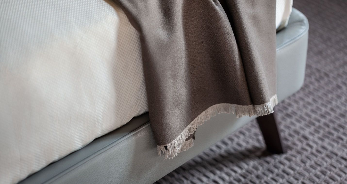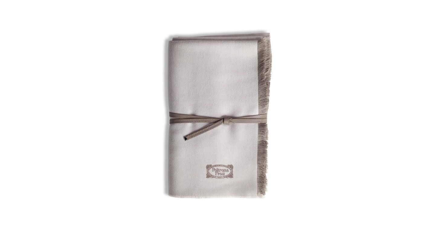 Every detail is exquisite. The Poltrona Frau logo is hand-stitched in contrasting turtledove silk thread. The fringe trim of the quilt offers an interplay of different sizes and colours: 3 mm long on the long sides with a tone-on-tone effect and 15 mm long in the same colour as the hand-stitched logo on the short sides. A leather strap in pumice Pelle Frau? Nest leather encircles the quilt, providing an easy storage solution.
