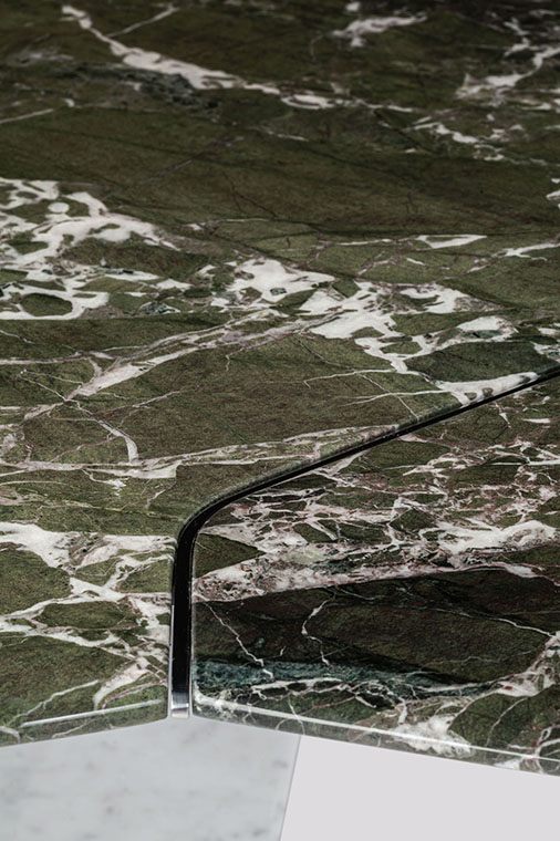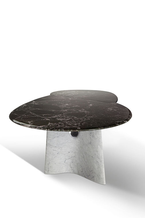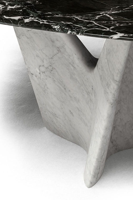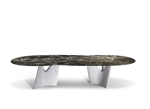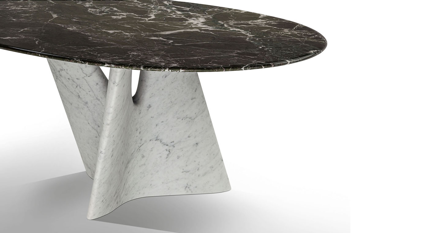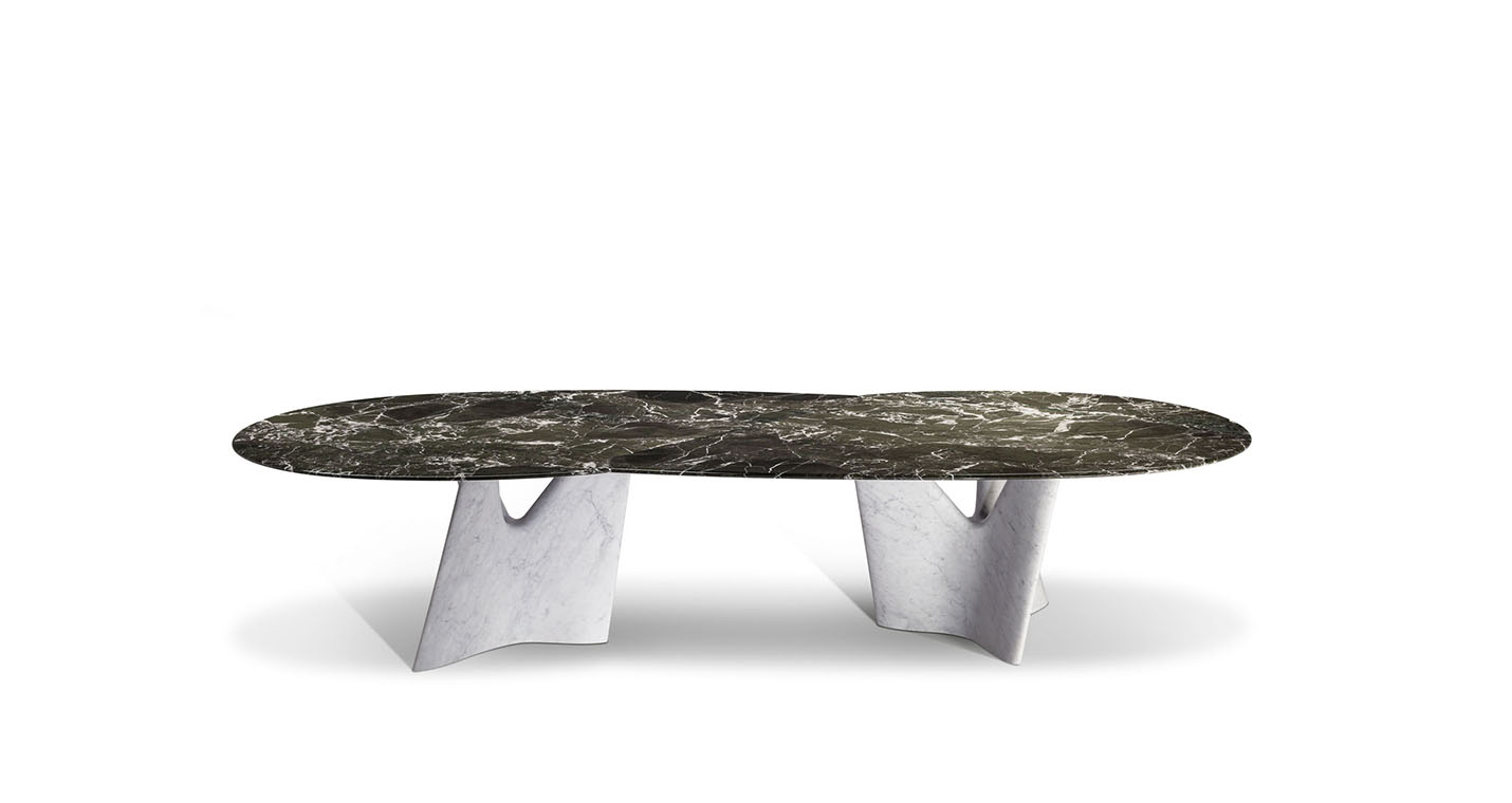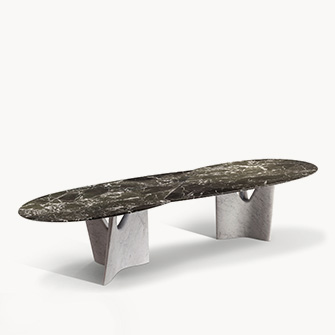 這一切都始自土耳其的一個採石場,在那裡挖掘出了珍貴的“紫羅紅”大理石,與生俱來從紅色到紫色的色調,白色條紋點綴其間。由于某些未知且莫名其妙的自然事件,山的一小塊有限的部分變成了濃重的鼠尾草色,并帶有深綠的漸變色,典型的淺色紋理從中穿過,還夾雜著一些小的紅色原色。Roberto Lazzeroni從中挖出一個帶有圓形線條的寬大桌面,凸顯出斑駁綠色所有漸變色中最明快或最朦朧的美感。不可複製的自然紋理,每件樣品都獨一無二。交錯的雙橢圓形狀部分使人聯想起陰陽的互補形式,部分像是個翻倒的8,象徵永無止境的完整和繁榮:由此得名。每只桌腳均由一整塊大理石雕鑿而成,但絕無沉重感的印象:樹狀“枝條”向外展開,盡顯輕盈與動感之態,進一步彰顯出桌子的優雅氣質和強烈的雕塑價值。