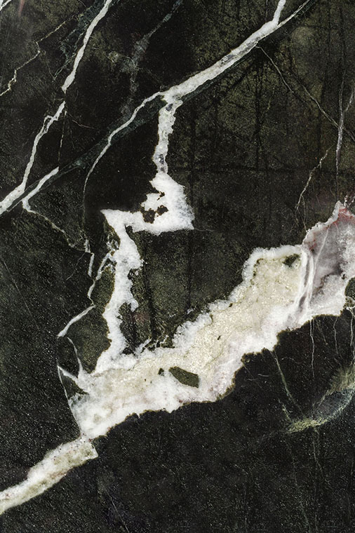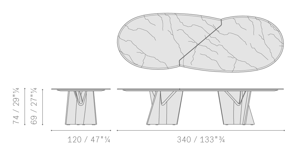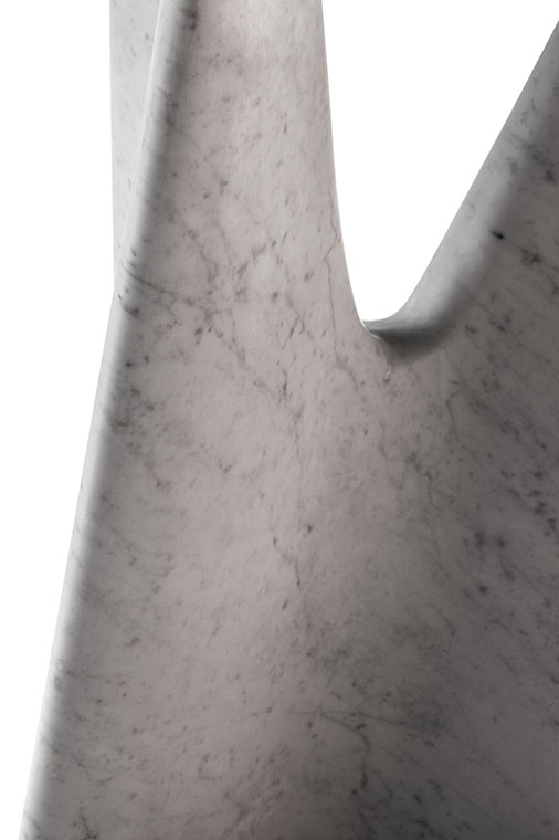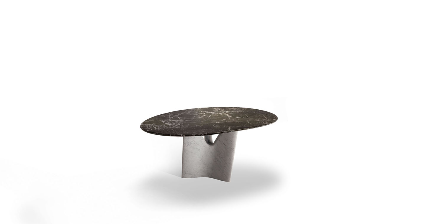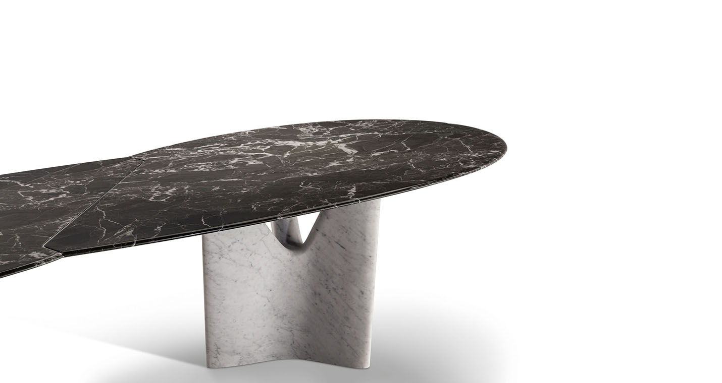 這一切都始自土耳其的一個採石場,在那裡挖掘出了珍貴的“紫羅紅”大理石,與生俱來從紅色到紫色的色調,白色條紋點綴其間。由于某些未知且莫名其妙的自然事件,山的一小塊有限的部分變成了濃重的鼠尾草色,并帶有深綠的漸變色,典型的淺色紋理從中穿過,還夾雜著一些小的紅色原色。Roberto Lazzeroni從中挖出一個帶有圓形線條的寬大桌面,凸顯出斑駁綠色所有漸變色中最明快或最朦朧的美感。不可複製的自然紋理,每件樣品都獨一無二。交錯的雙橢圓形狀部分使人聯想起陰陽的互補形式,部分像是個翻倒的8,象徵永無止境的完整和繁榮:由此得名。每只桌腳均由一整塊大理石雕鑿而成,但絕無沉重感的印象:樹狀“枝條”向外展開,盡顯輕盈與動感之態,進一步彰顯出桌子的優雅氣質和強烈的雕塑價值。