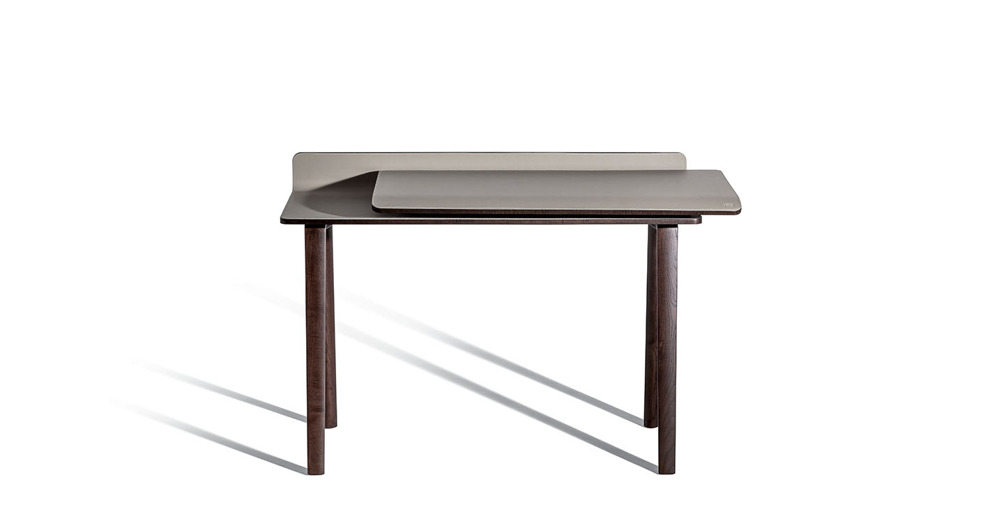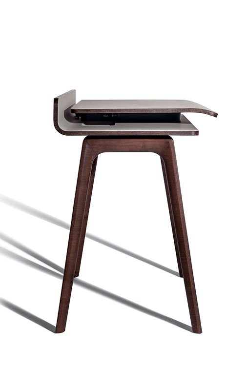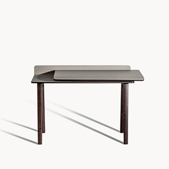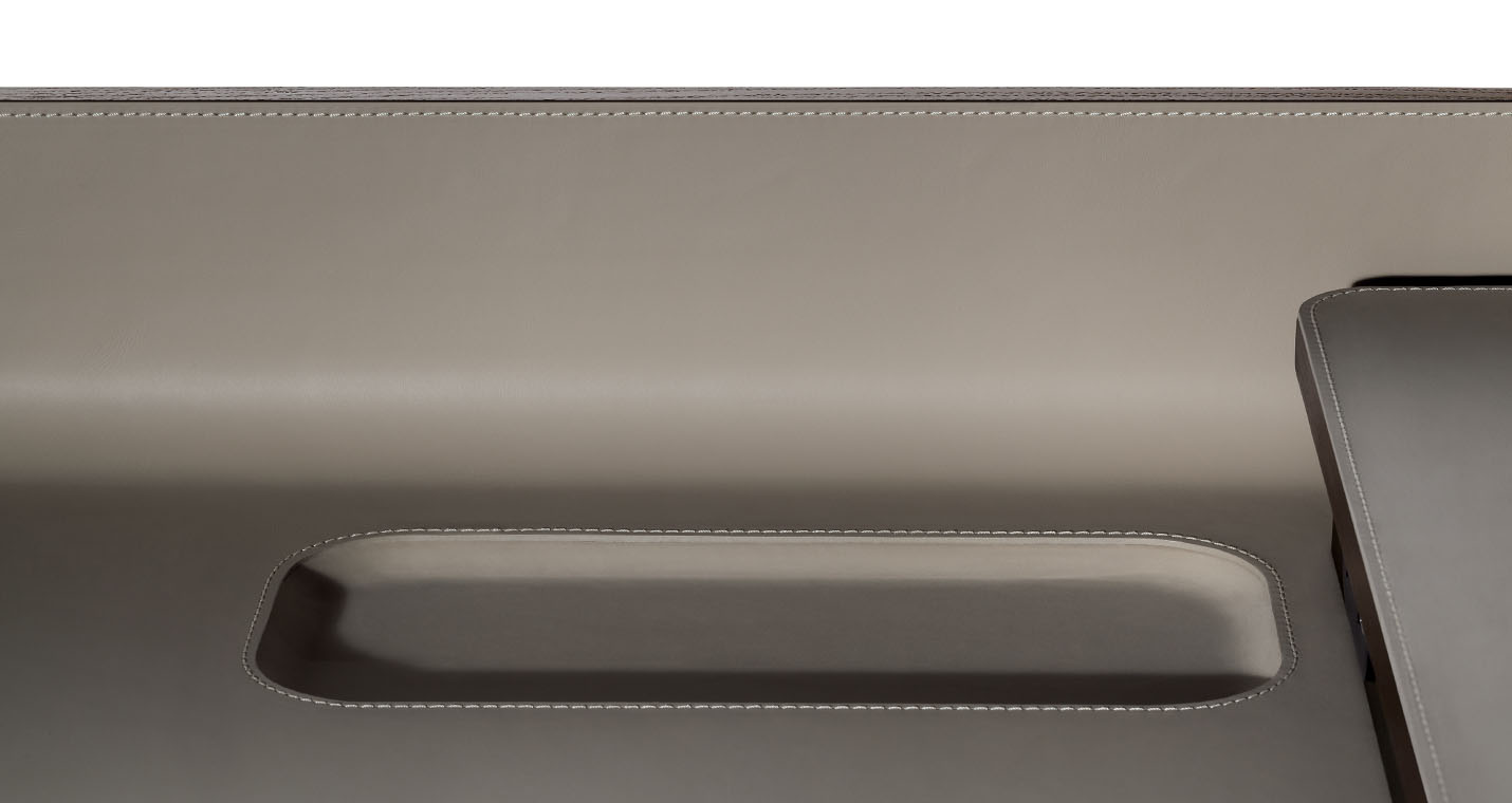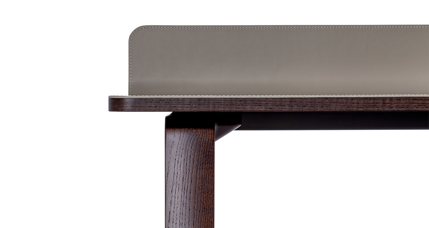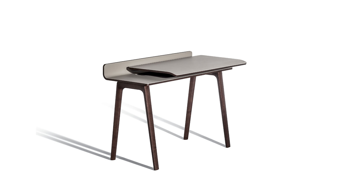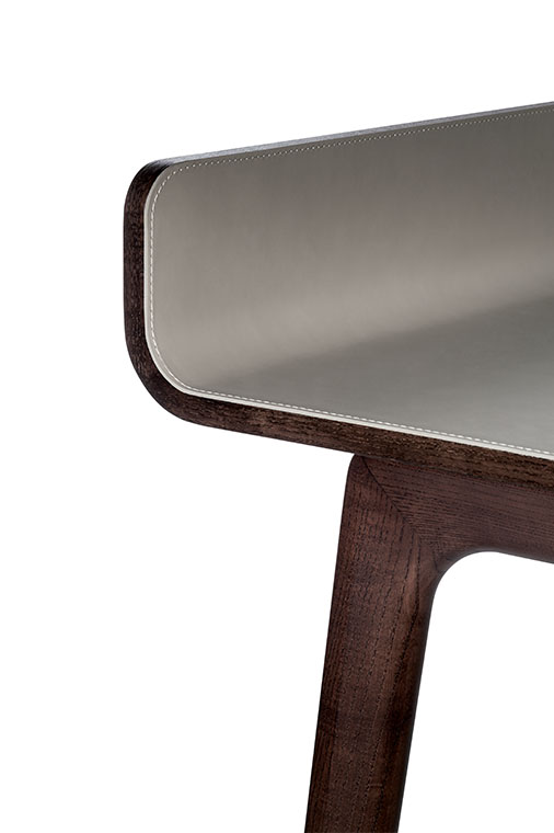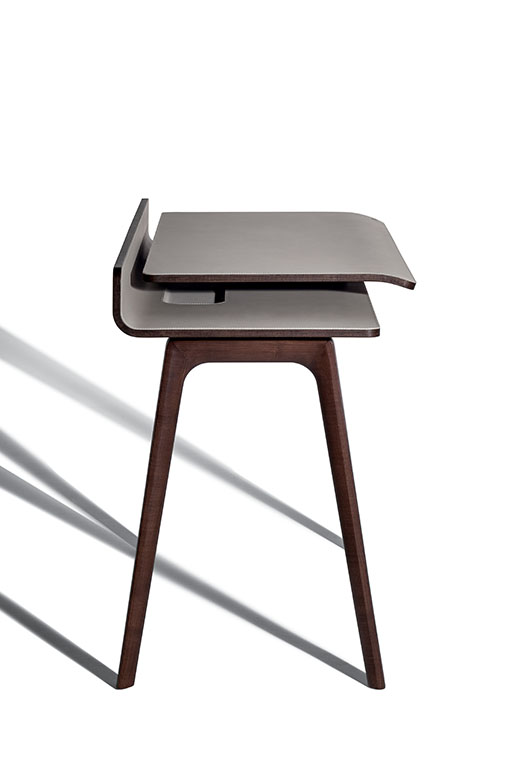 Poltrona Frau的Iren寫字臺包括獨立式版本,其檯面架在畫架式白蠟木實木基座上;另外還有壁掛式,安裝在銷桿上。訂購時,客戶可以選擇向左或向右滑動。