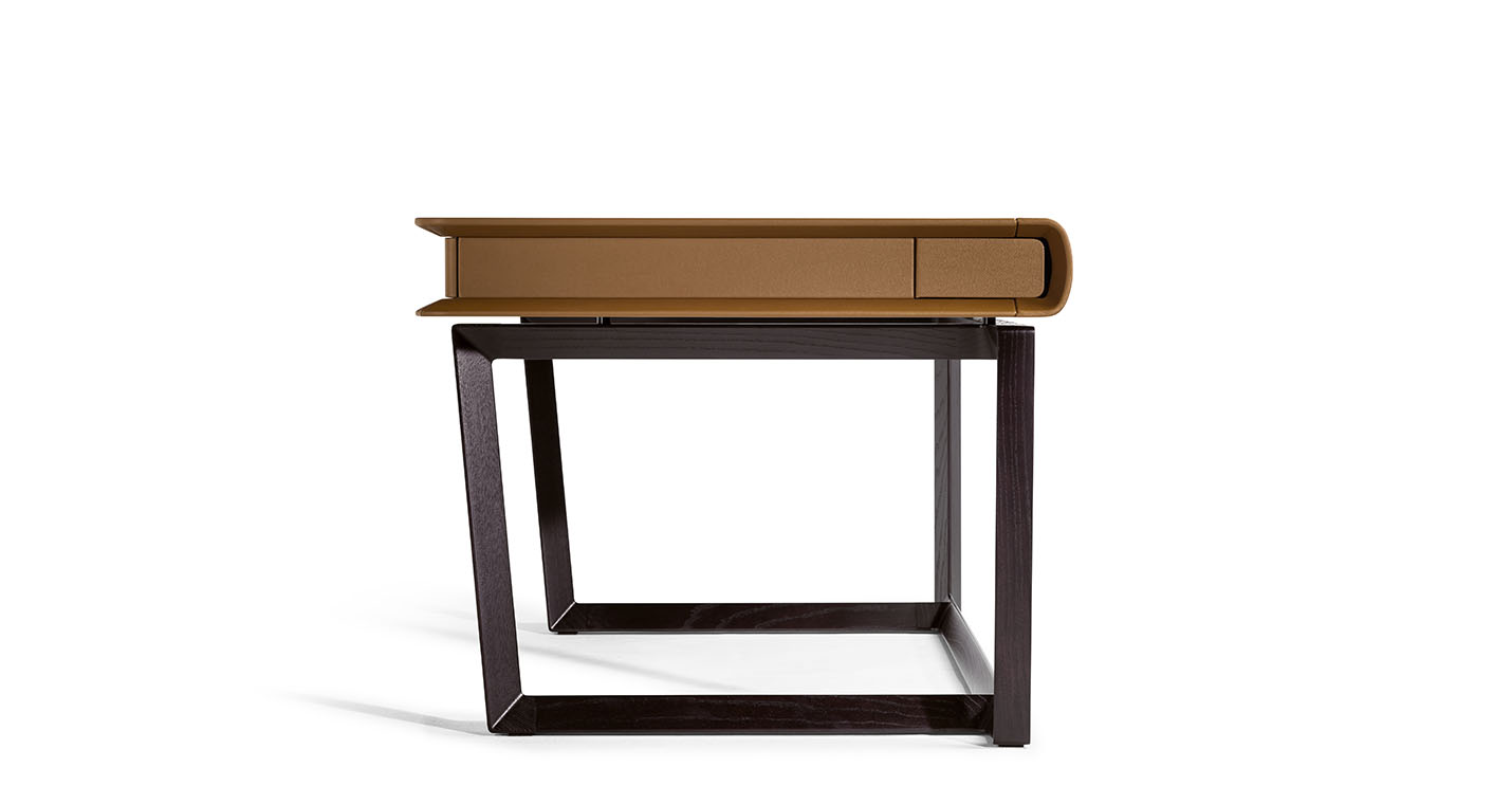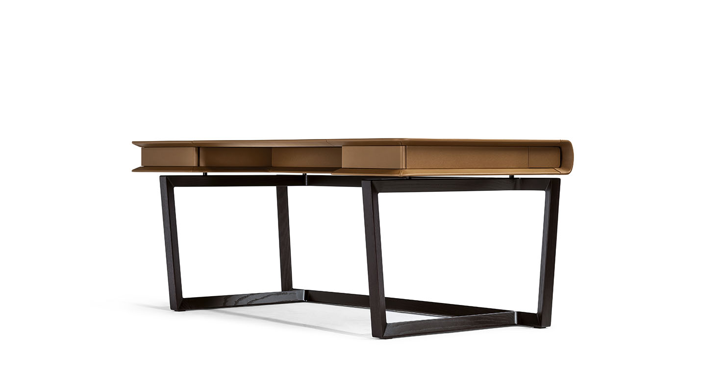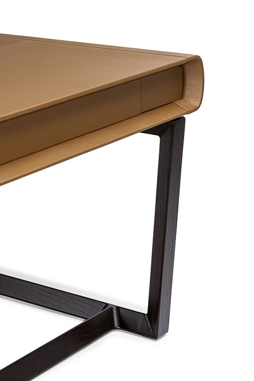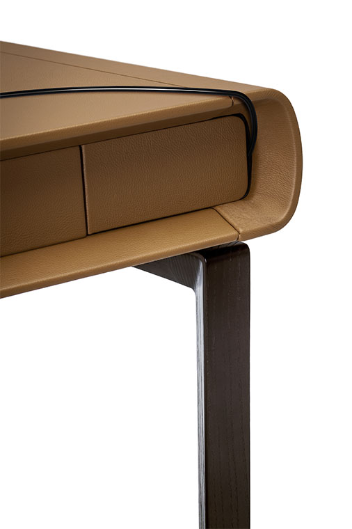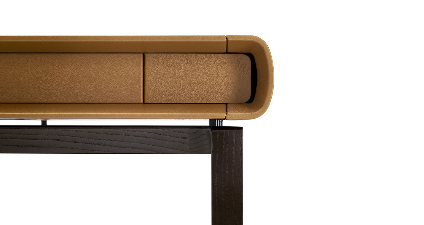 底座結(jié)構(gòu)由一個(gè)摩卡色或雞翅木色三角形截面實(shí)心白蠟?zāi)九_(tái)架構(gòu)成,形成三個(gè)梯形周邊,并彼此用木材加工而成的精美接頭連接在一起。兩個(gè)抽屜的面板為中密度纖維板,採(cǎi)用與檯面覆面相搭配的PelleFrau?軟皮覆蓋,內(nèi)部結(jié)構(gòu)則用雞翅木色實(shí)心白蠟?zāi)狙u成。檯面、抽屜面板、側(cè)壁和后部隔間的小門(mén)均採(cǎi)用Pelle Frau? ColorSphere軟皮覆蓋。