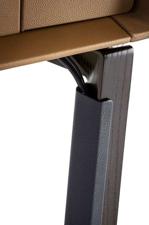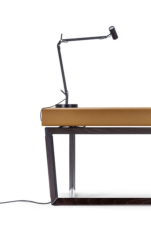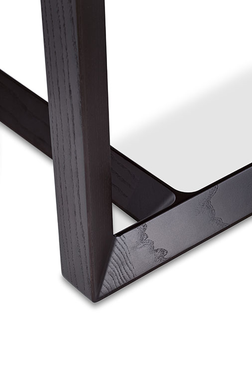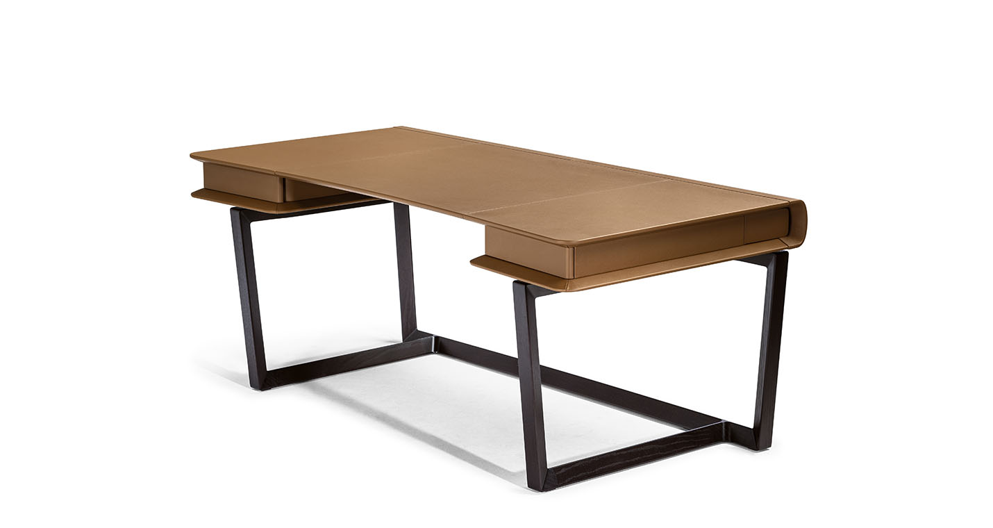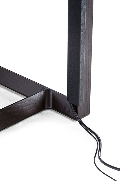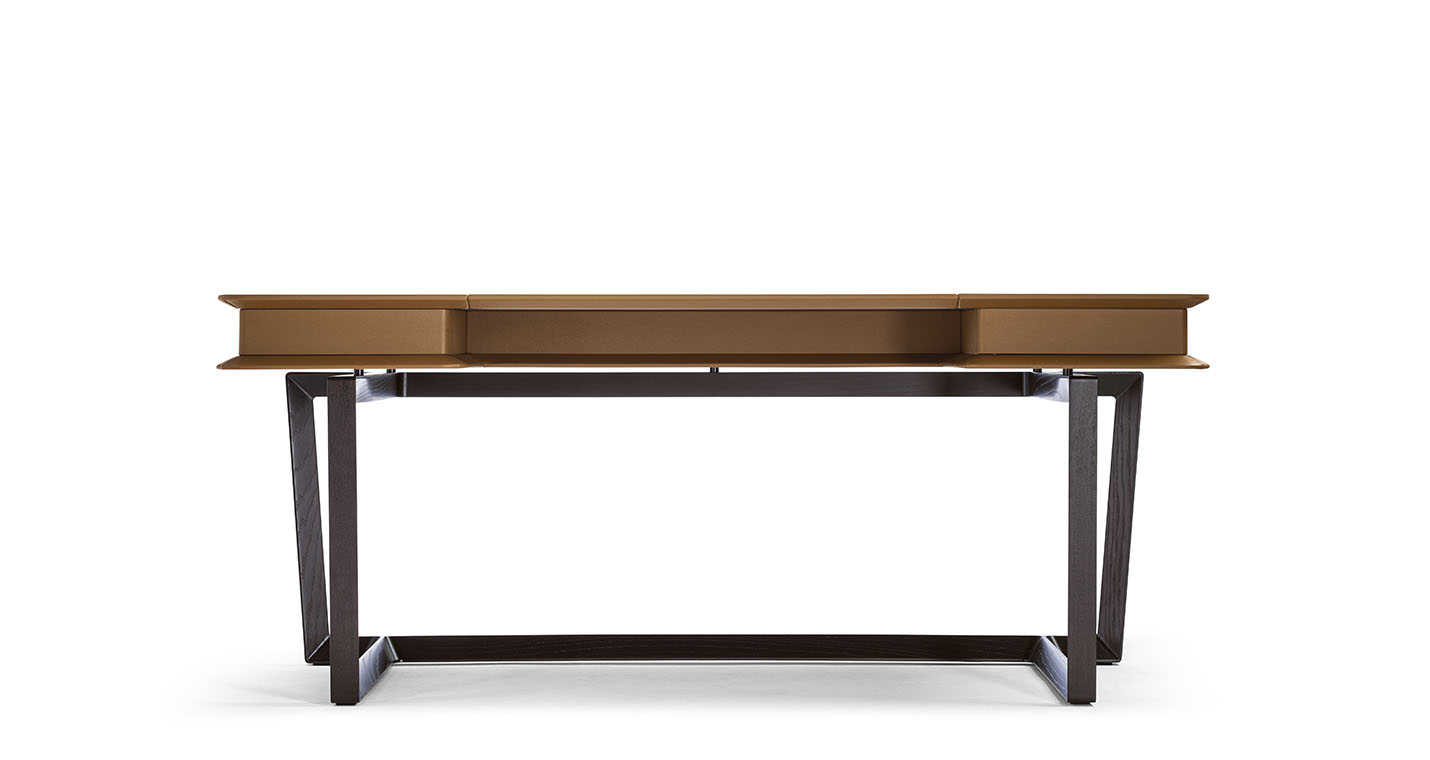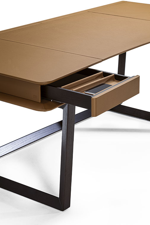 底座結(jié)構(gòu)由一個(gè)摩卡色或雞翅木色三角形截面實(shí)心白蠟?zāi)九_(tái)架構(gòu)成,形成三個(gè)梯形周邊,并彼此用木材加工而成的精美接頭連接在一起。兩個(gè)抽屜的面板為中密度纖維板,採(cǎi)用與檯面覆面相搭配的PelleFrau?軟皮覆蓋,內(nèi)部結(jié)構(gòu)則用雞翅木色實(shí)心白蠟?zāi)狙u成。檯面、抽屜面板、側(cè)壁和后部隔間的小門(mén)均採(cǎi)用Pelle Frau? ColorSphere軟皮覆蓋。