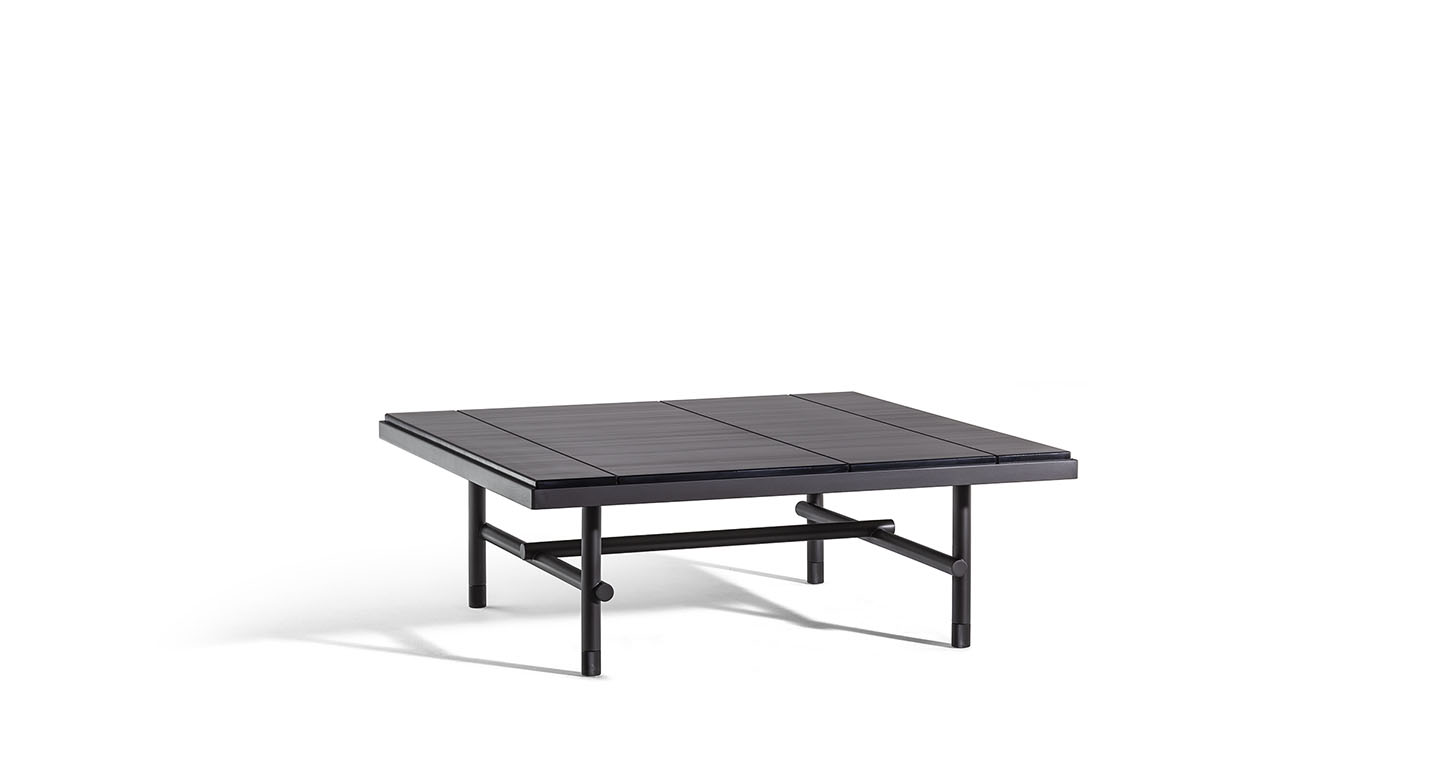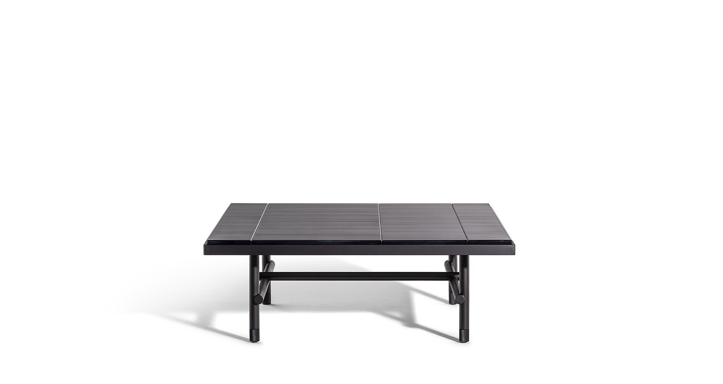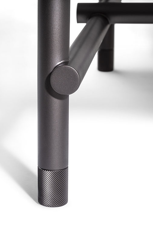Pierre咖啡桌結(jié)構(gòu)由L型鋁型材框架和下方鋼管基座組成,并配有鋁質(zhì)滾花支腳。整體噴漆,採(cǎi)用亮面表面處理。