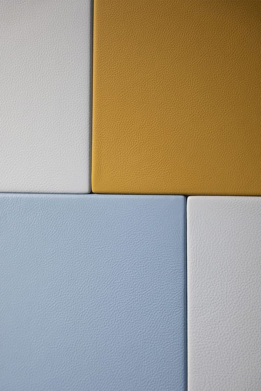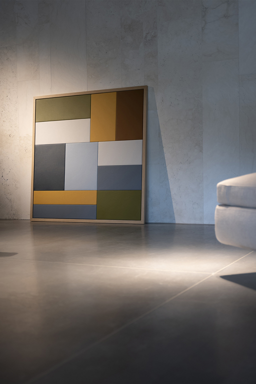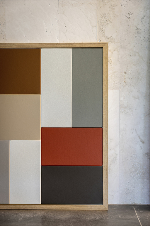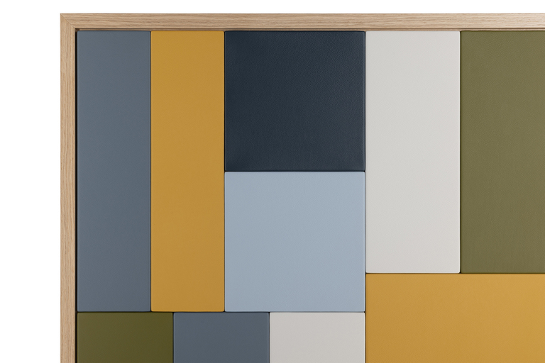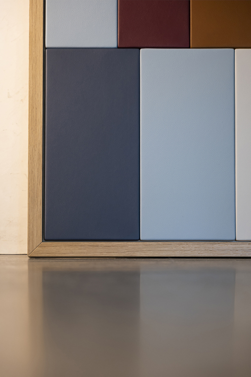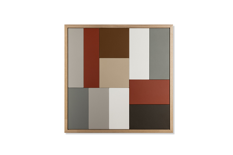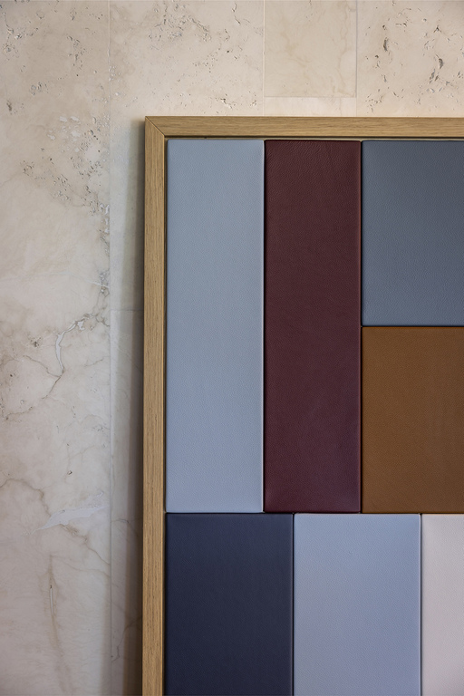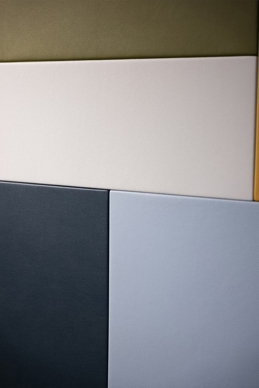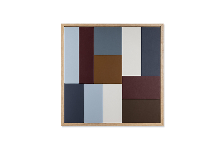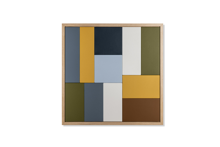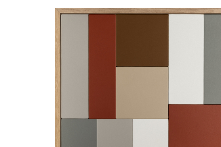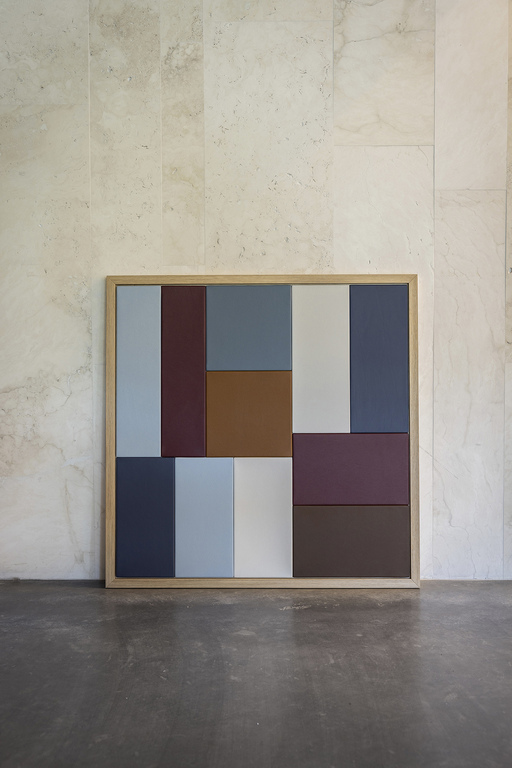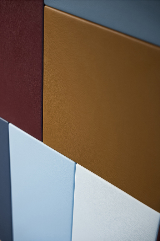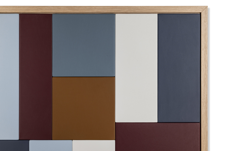A graphic wall composition, created through the chromatic alphabet of Pelle Frau leather. The Tableau, designed by Simona Cremascoli, are decorative squares with simple, geometric graphics. They are experiments that evoke the Bauhaus' chromatic exercises on the "movement" of colour. But rather than using a brush, the designer uses leather, Poltrona Frau's material par excellence, masterfully worked by its artisans.