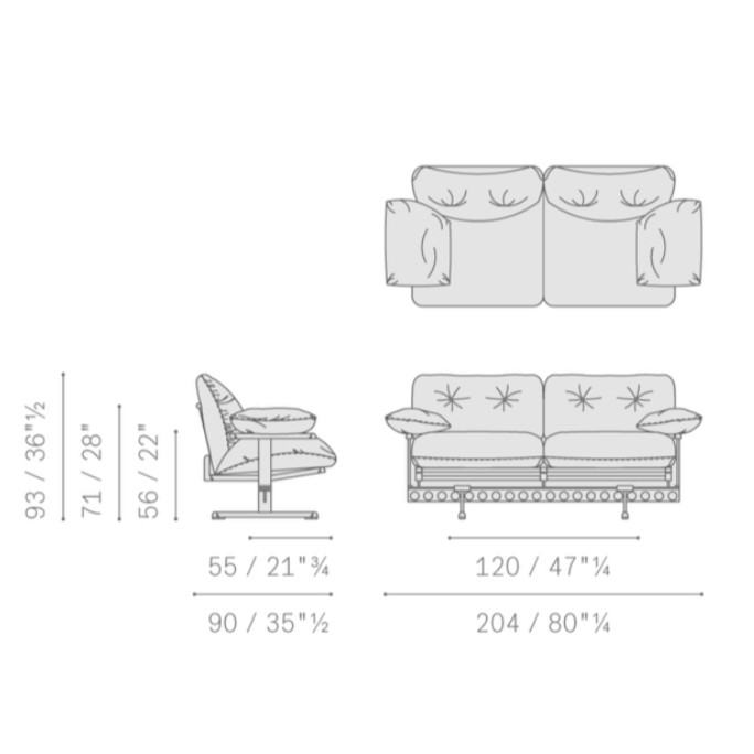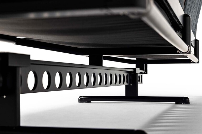 The steel frame is airy and slender. The “T”-shaped beam is separated from the crossbars that support the seat in such a way that the padded part of the sofa appears to float in the air. The load-bearing beam, free of joints, is connected by aluminium profiles in a sophisticated play on interconnections that are clearly visible from the side. The high-tech aesthetic of the metal parts, all of which are finished with matt black epoxy powder paint, contrasts with the warmth and softness of the cushions.