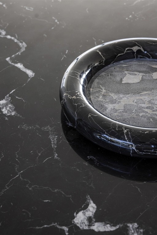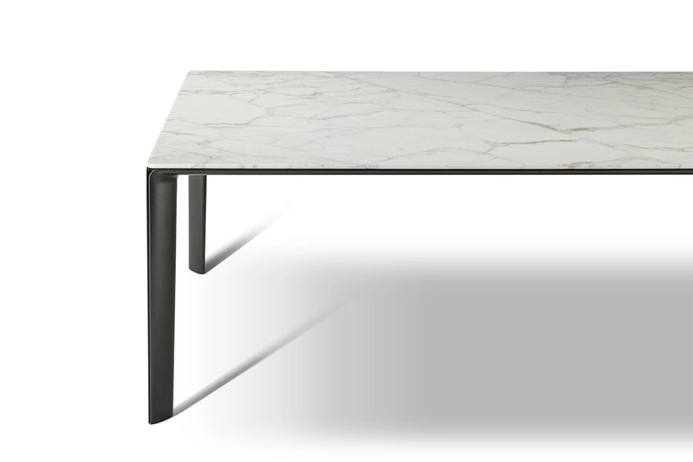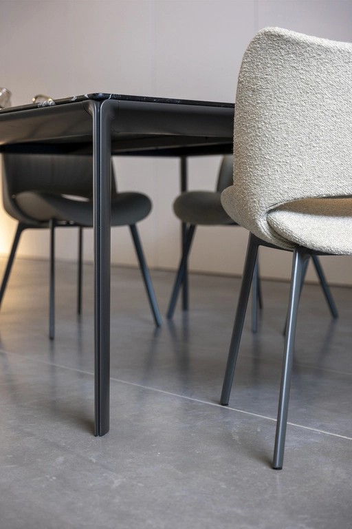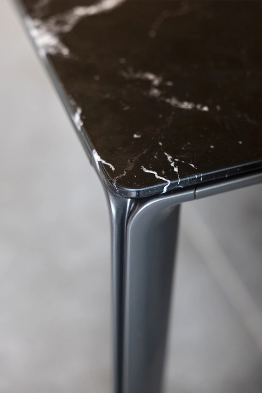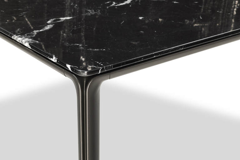 The Homey dining table designed by GamFratesi aims to shine a renewed light on the value of the home and emphasize the centrality of its role in domestic settings that are increasingly attentive to sharing. This designer table is compact and graphic, characterised by light but volumetric lines, enriched by fine and expertly worked materials. The quintessence of Homey is expressed in its die-cast aluminium legs. In a sculptural play reminiscent of haute couture, the two leg flaps fold and join together without touching, creating a chiaroscuro effect in the centre. A refined stylistic exercise that recalls the workmanship of leather, Poltrona Frau's material of choice. The lines of the two flaps open slightly at the top to transform into the shelf that supports it.