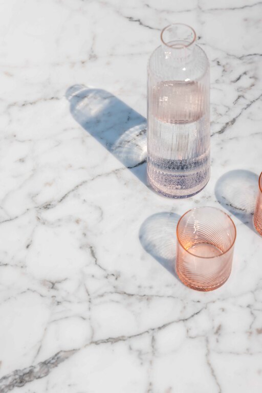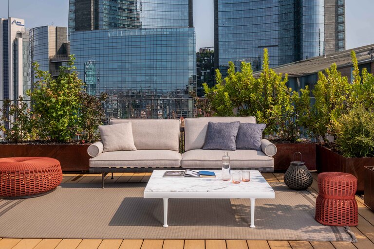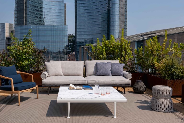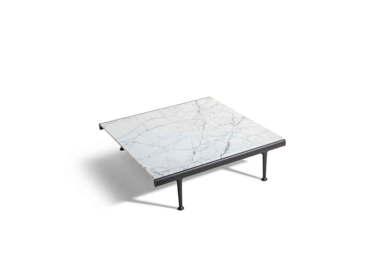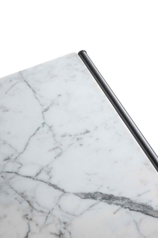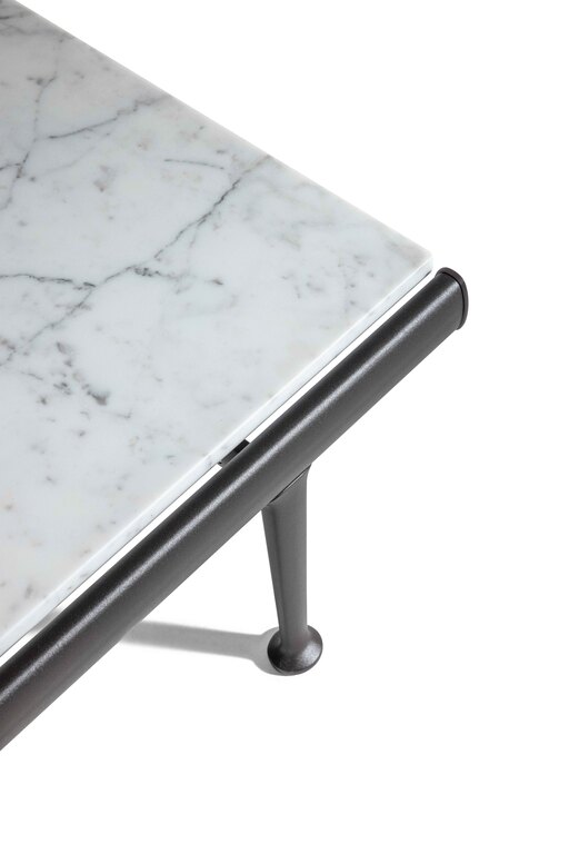 Souvenir d'Italie is made of only two materials: metal and marble. The top is made of refined Arabescato Marble with a natural finish, allowing the uniqueness of each quarry block to highlight the interplay of the dark grey veins. The supporting structure is made of extruded aluminium lacquered in Gesso and Basalto shades, which warm the material, evoking shades closer to nature, while the feet of the table are made of cast aluminium, with a finely embossed powder coating.