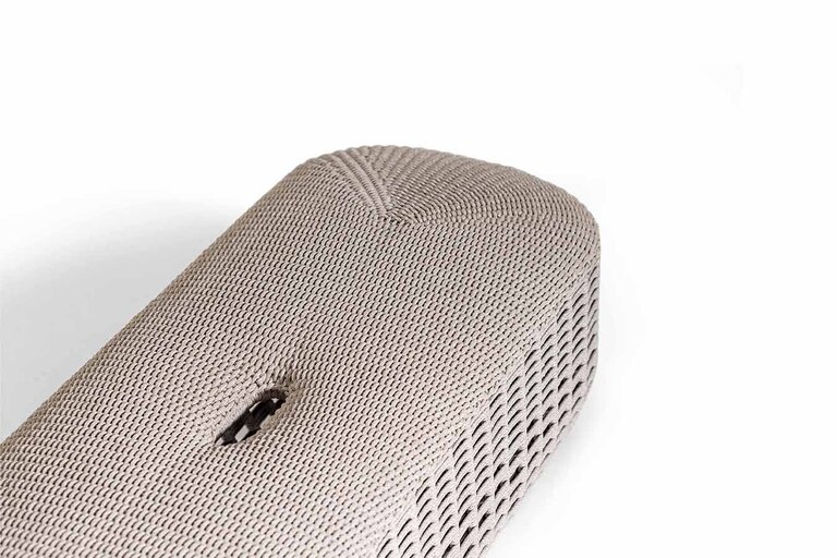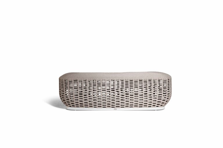 Its sculptural design takes shape from the material: a hand-woven polypropylene string on the aluminium rod structure. The gradient weave thickens upwards to become a solid surface that conceals the seat's elastic belt springs, offering unexpected comfort. The pouf is available in 3 colour combinations that match the colour of the rope and the structure. A light bench that offers small dimensions and refined breathability, with materials and colours able to interact with all the Poltrona Frau Boundless Living Outdoor Collections.