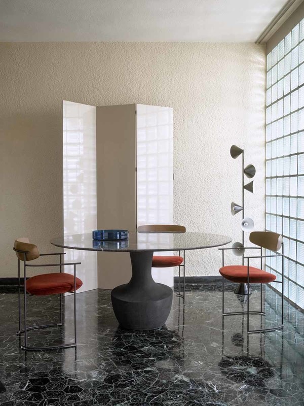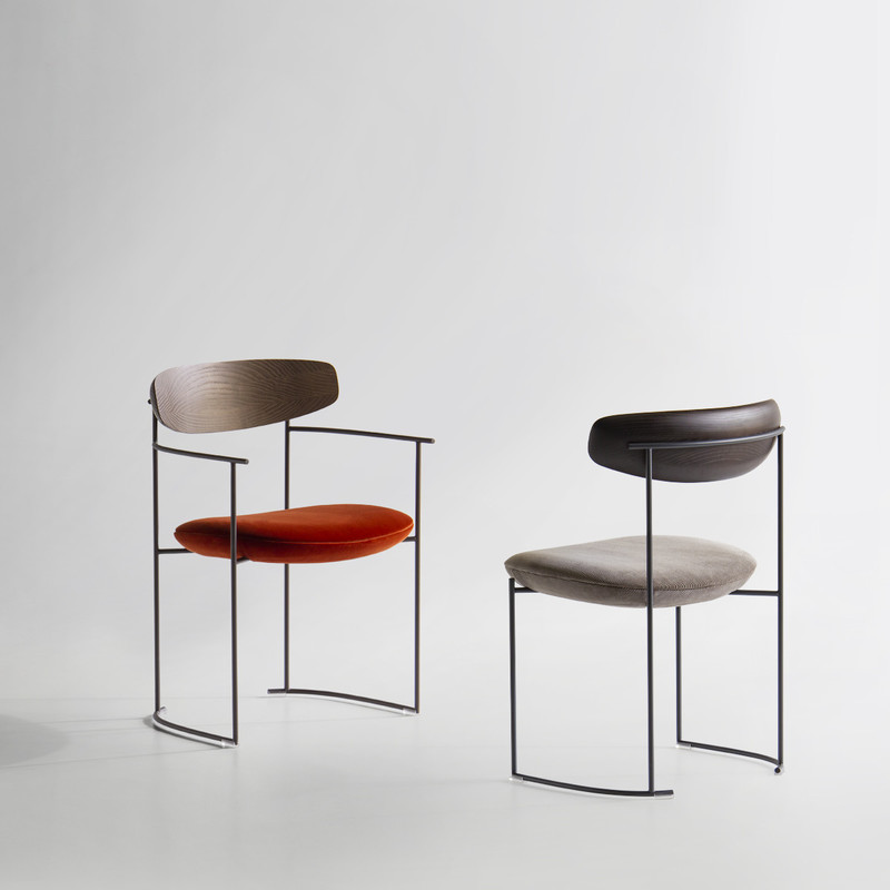 Keel chair and small armchair were born from the research between geometric rigor and organic sinuosity.
