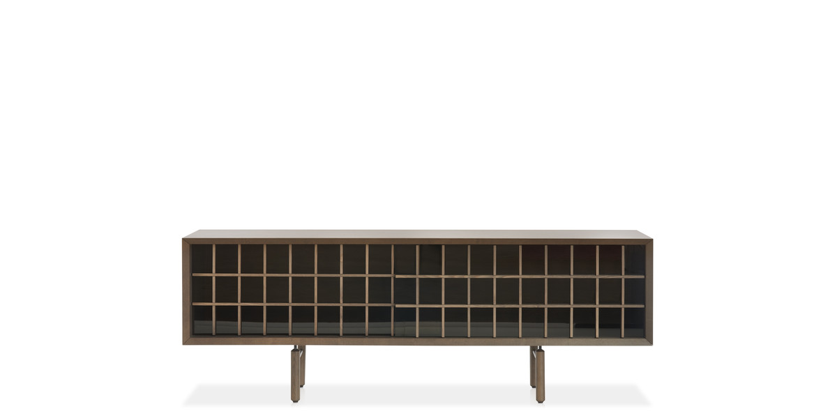The design of the ash wood volume tones down thanks to the visual lightness created by the crossed grilles in solid ash wood, attached to sliding doors in tempered bronzed or transparent glass, hiding internal shelves at different heights.