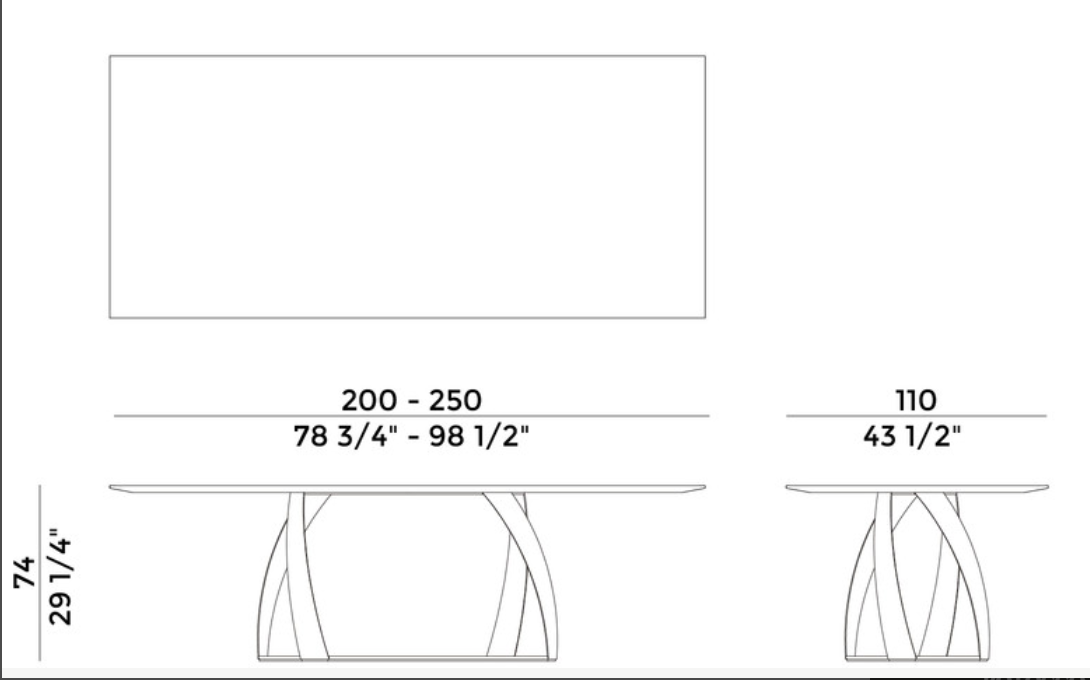 Table with elongated base and rectangular top in Canaletto walnut, marble or transparent tempered glass. Materials as per collection.