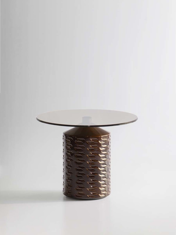 The base in ceramic, presented in the new Chocolate finish, characterized by a handcrafted geometric-patterned bas-relief decoration, which through the deposit of the crystalline creates refined chromatic effects, distinguishes the Hishi coffee tables' family.