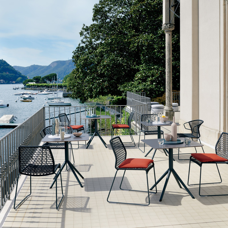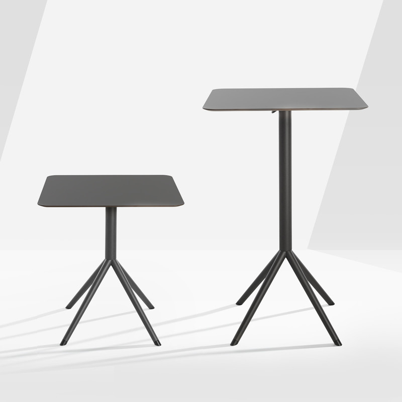 Katana is a table designed to adapt to both domestic interiors and open-air contexts, proposed in a version with four legs in embossed painted metal and rectangular top in laminated porcelain or HPL, in the finishes as per collection.